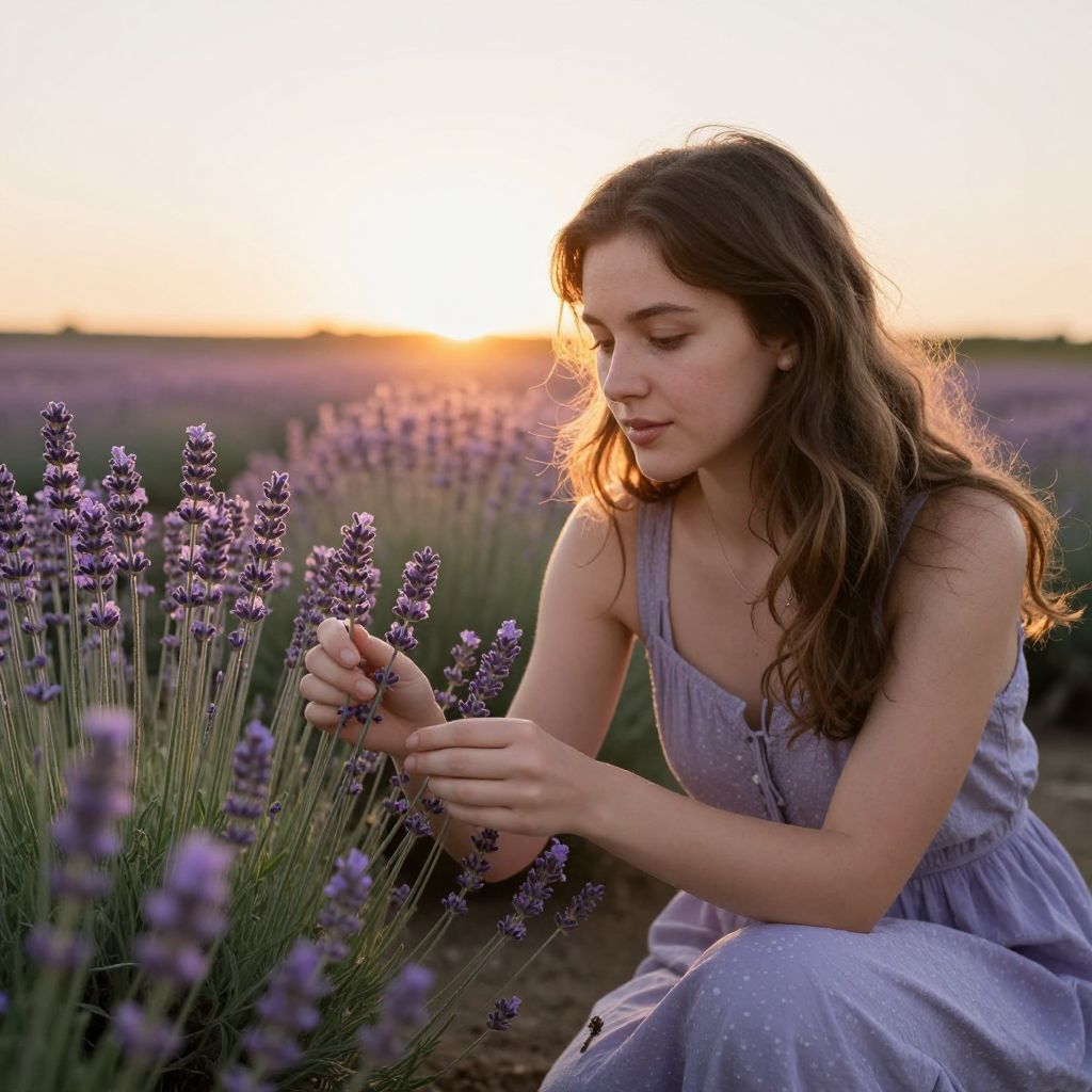 Photograph of a young Caucasian woman with long, wavy brown hair, wearing a sleeveless, light purple dress with small white polka dots. She is crouching in a lavender field at sunset, gently touching the purple flowers with her right hand. The background shows a vast field of lavender with a golden sunset sky, casting a warm, orange glow. Her expression is calm and focused. The image has a soft, warm color palette with delicate textures, highlighting the natural beauty of both the woman and the lavender flowers.