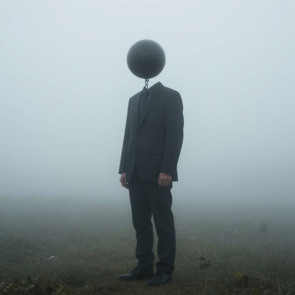 A man standing in the fog who has a ball and chain instead of a head. artwork, surrealist, metaphysical, metaphorical, ephemeral, atmospheric, symbolic art.