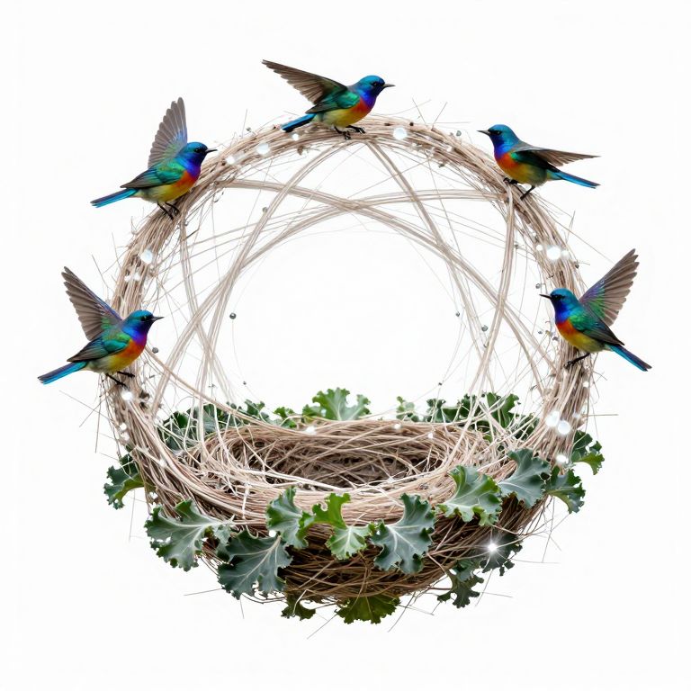 Birds with kaleidoscope feathers construct floating nests using strands of moonlight woven into shifting geometric patterns.