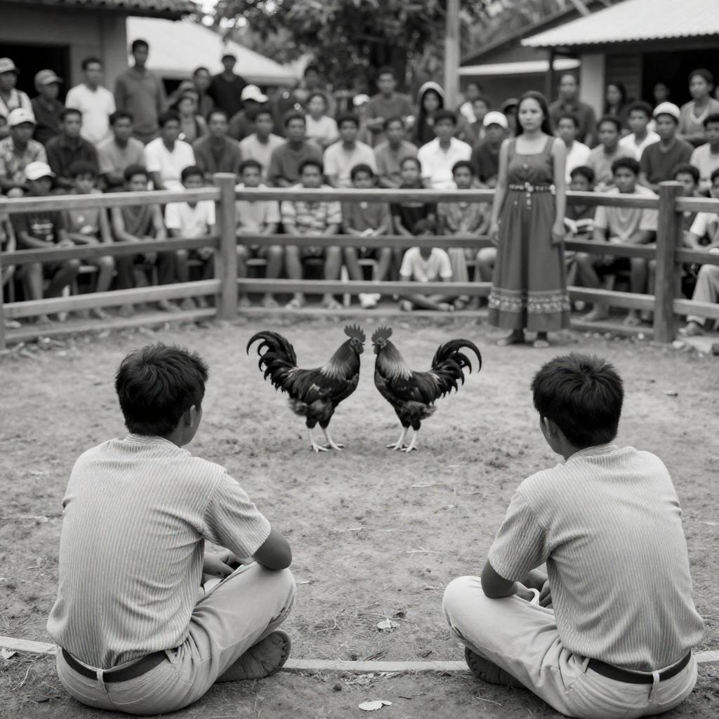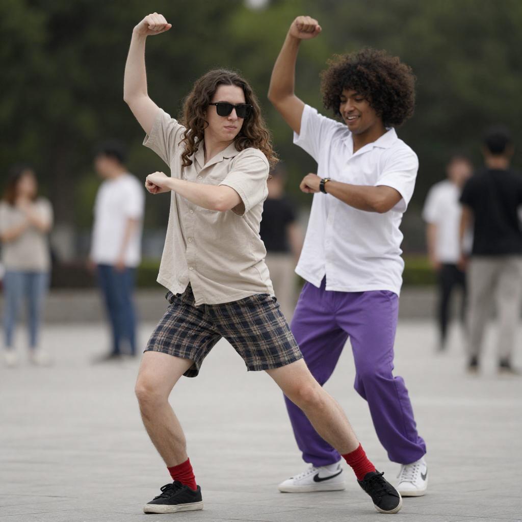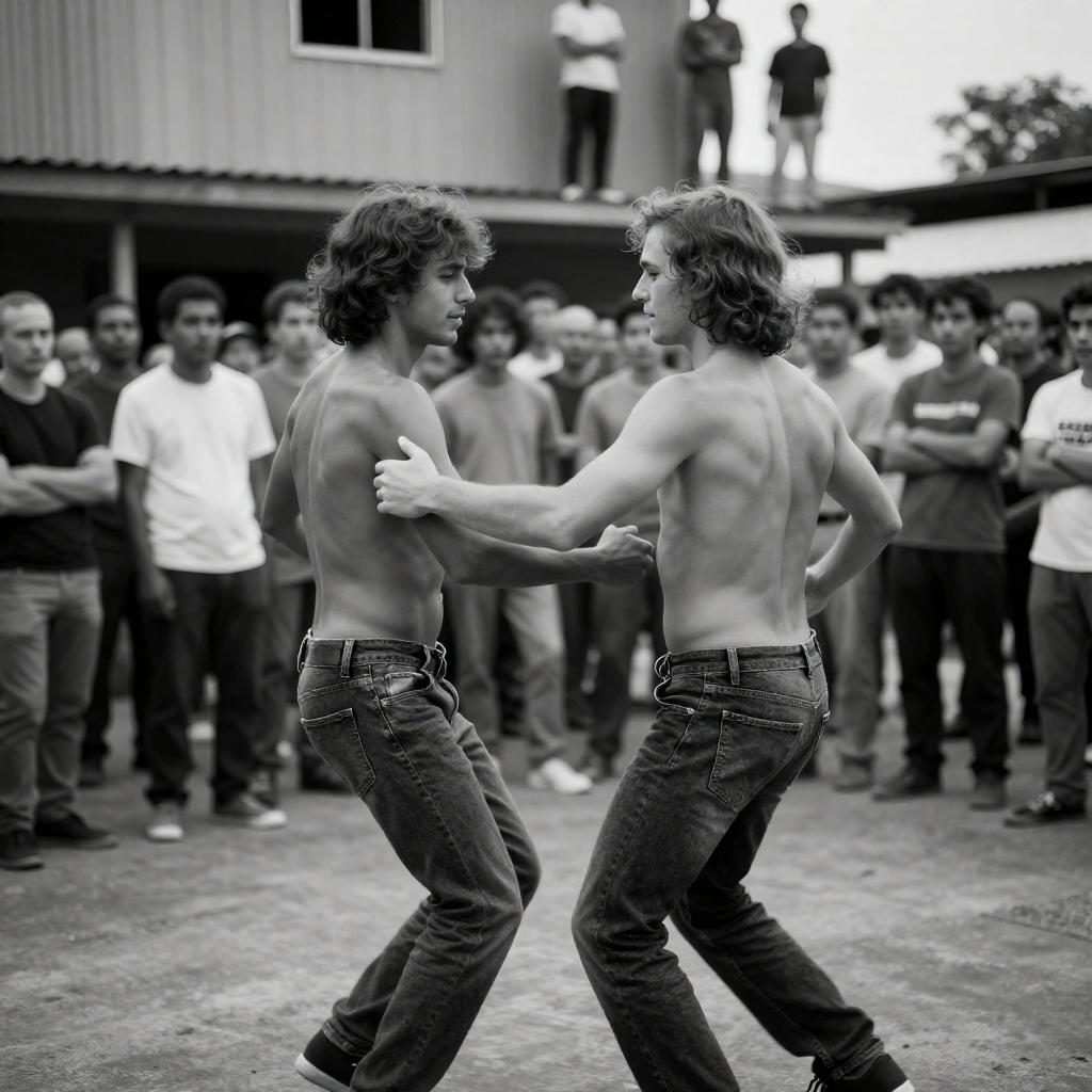 Black-and-white photograph of two shirtless men dancing energetically in the foreground, surrounded by a large crowd of onlookers. The men have medium-length hair and wear jeans. The background includes a building with a corrugated metal wall and several people standing on it. The image has a high-contrast, gritty ure.