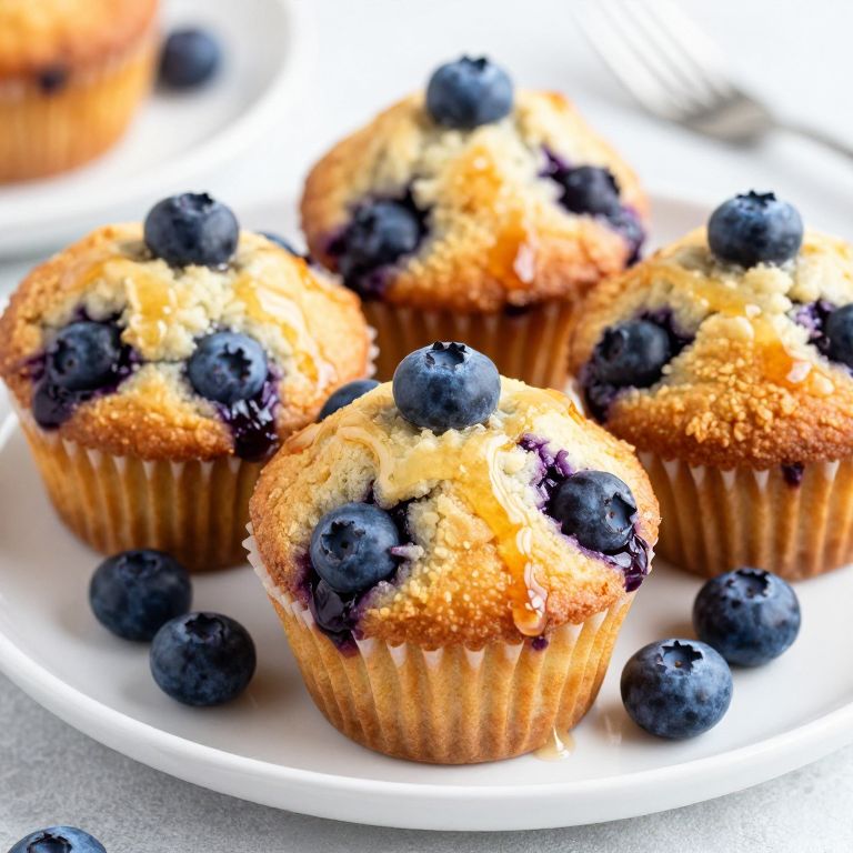 Photograph of freshly baked blueberry muffins with golden-brown tops, generously topped with plump blueberries, on a white plate.