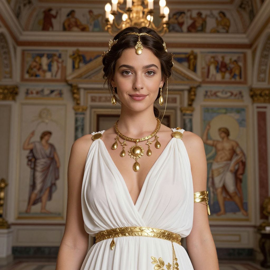 Photorealistic CGI of a beautiful woman with dark hair in an ancient Greek-style white gown, adorned with gold jewelry and headpiece, standing in an
