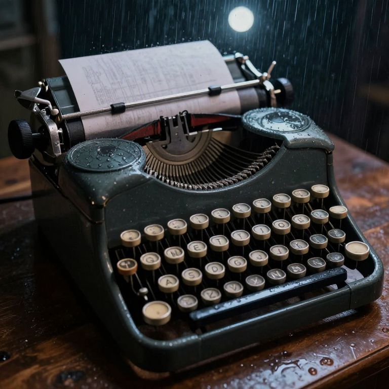 A vintage typewriter, bathed in moody, atmospheric lighting, sits on a wooden surface, its keys poised as if ready to craft tales that emerge only under the enchantment of moonlit rain, blending retro charm with a touch of surreal, cyberpunk-inspired mystique.