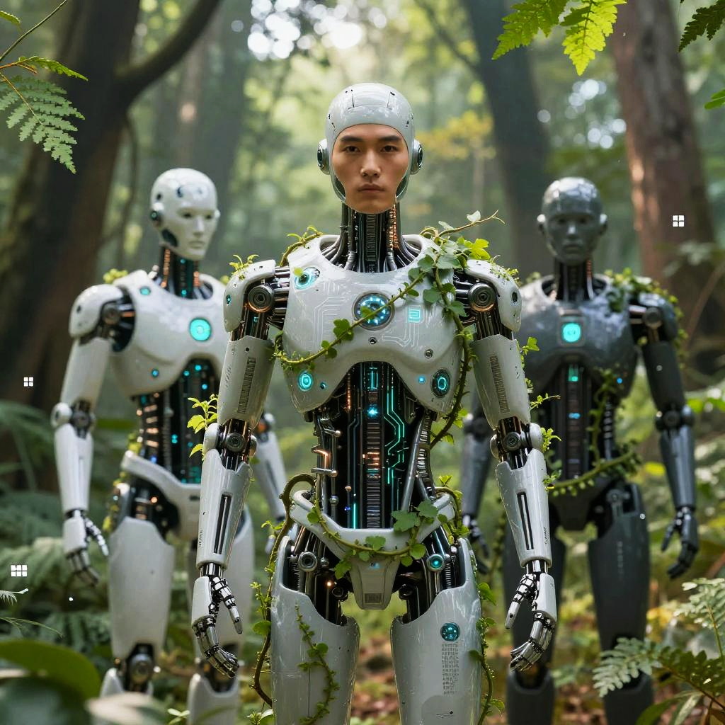 AI boys integrated into nature, portrayed as bio-mechanical humanoids in a lush digital forest, blending organic and artificial elements with glowing circuitry entwined with vines, soft sunlight filtering through pixelated leaves, harmonious fusion of technology and nature.