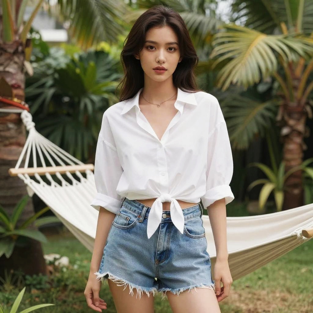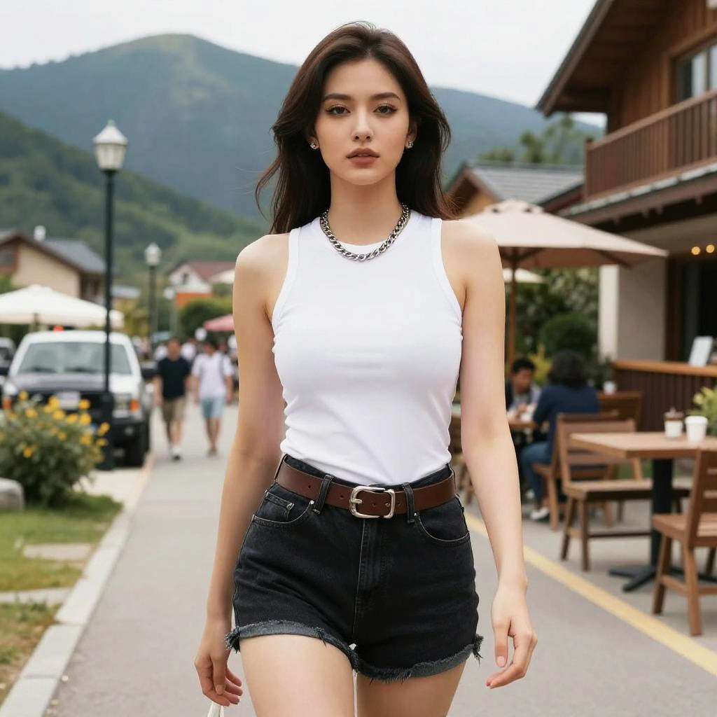 A slim woman in a casual chic outfit featuring a white ribbed crew neck T-shirt and high-waisted light blue jeans, adorned with a simple black choker, stands under string lights at a park picnic, evoking a vibrant seven seas visual style. Sexy. Pretty face and beutiful eyes