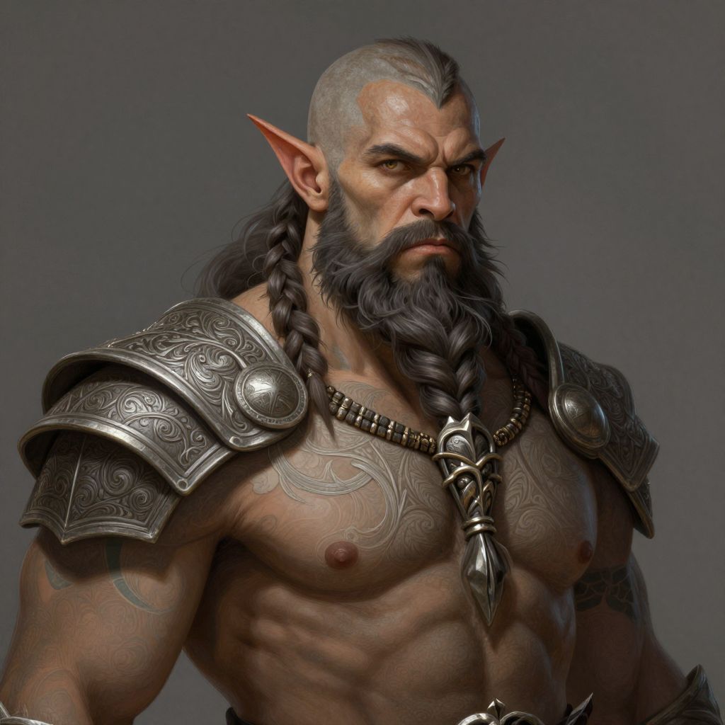 This is a highly detailed, digital CGI rendering of a muscular, male, fantasy elf warrior. He has a bald head, long, braided black beard, and pointed ears. His chest is bare, showcasing intricate tattoos and a well-defined, muscular physique. He wears ornate, silver, medieval-style armor on his shoulders, with a decorative, metallic necklace featuring a large, dagger-like pendant. His expression is stern and intense. The background is a simple, gradient gray, focusing attention on the character. The lighting highlights his muscular definition and the texture of his armor.