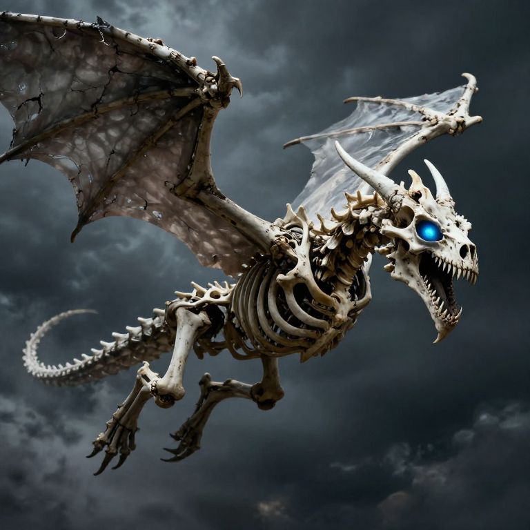 Digital artwork of a skeletal, winged dragon with glowing blue eyes, sharp claws, and jagged wings, soaring against a dark, cloudy sky.