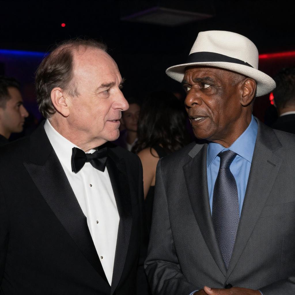 Photograph of two older men in pinstripe suits and fedoras. Both wear neckties, one red with gold pattern, one striped. Background features cartoonish yellow and blue mural. Smiling man on right, slightly grayer-haired man on left. Both wear dark hats.