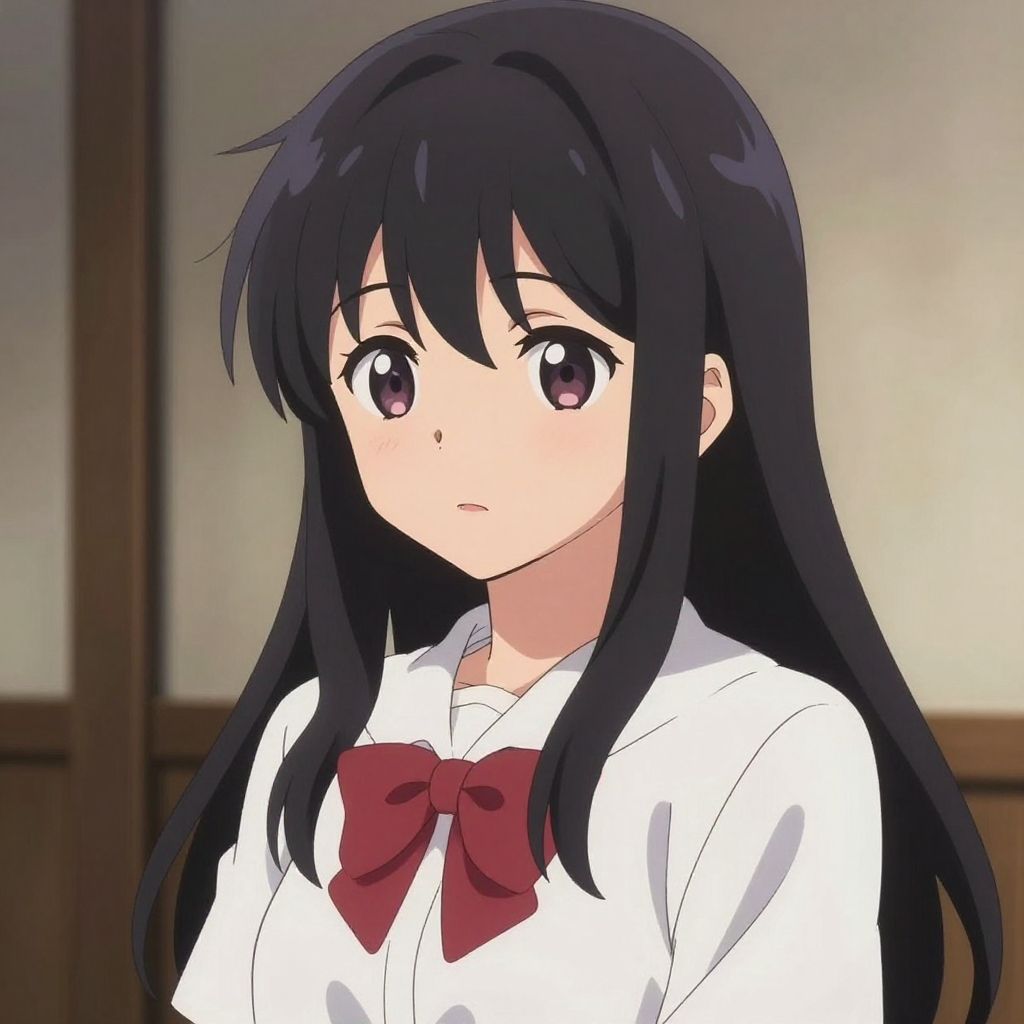 Digital anime-style drawing of a young girl with large blue eyes, black wavy hair, and a black lace dress, sitting at a sunlit table