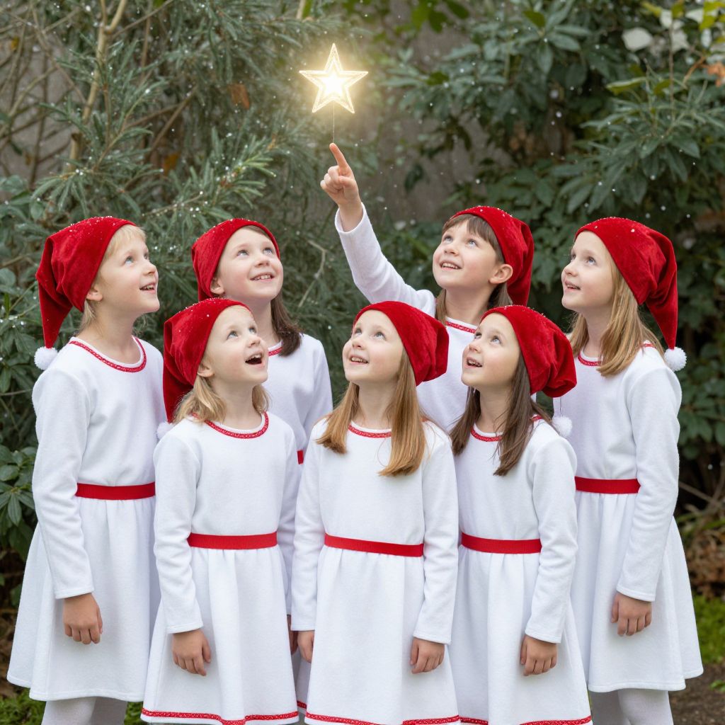 Photograph of six young girls in white dresses with red belts and hats, pointing at a glowing star, surrounded by greenery.