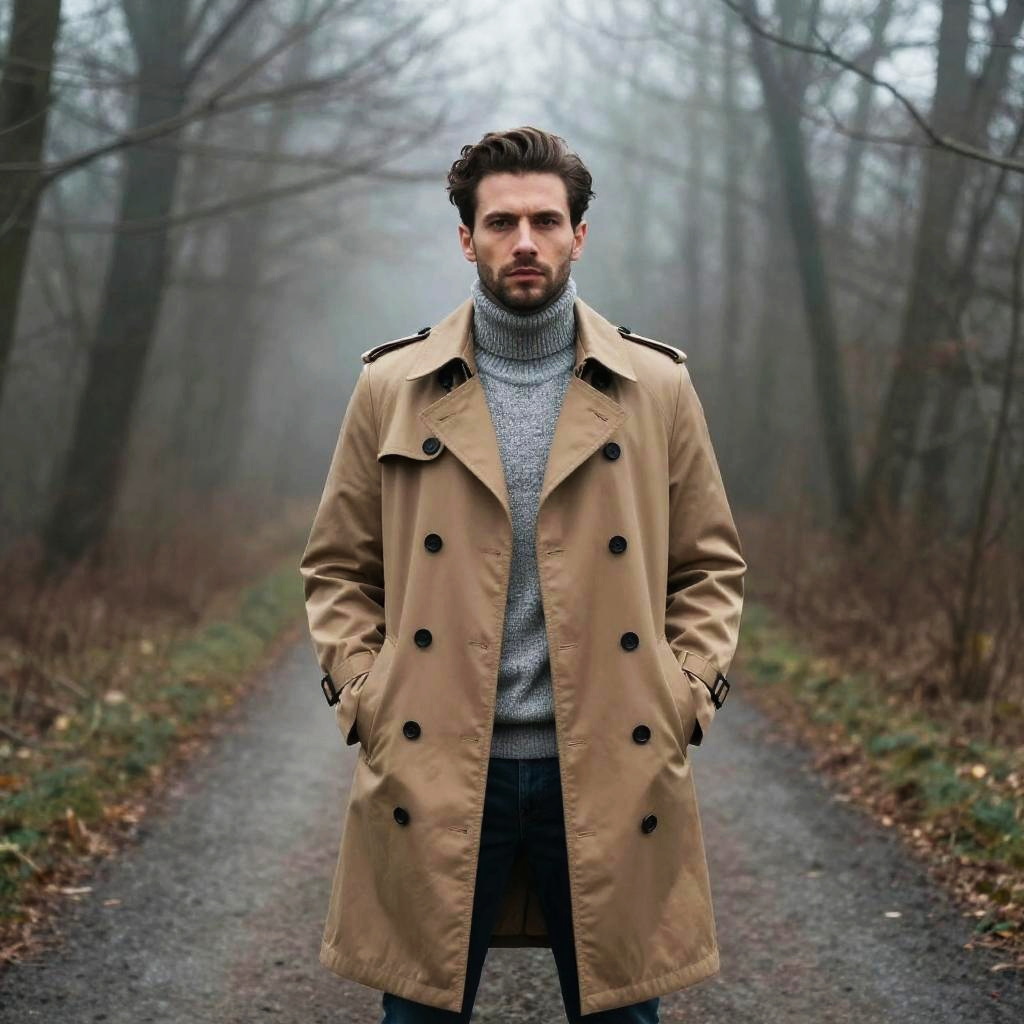 A man stands confidently on a misty forest path, wearing a stylish camel trench coat over a textured gray sweater. The moody atmosphere and subdued tones create a cinematic and contemplative mood, emphasizing the forest's bare trees and foggy background.