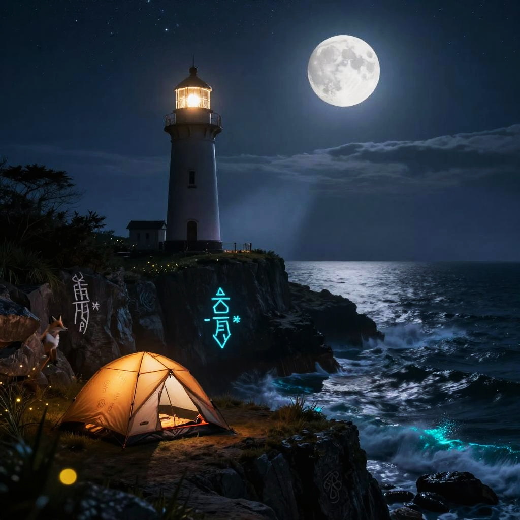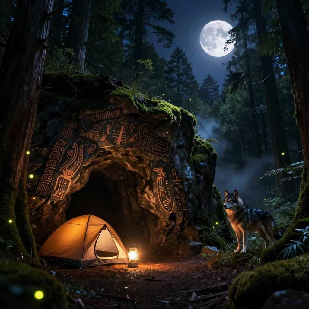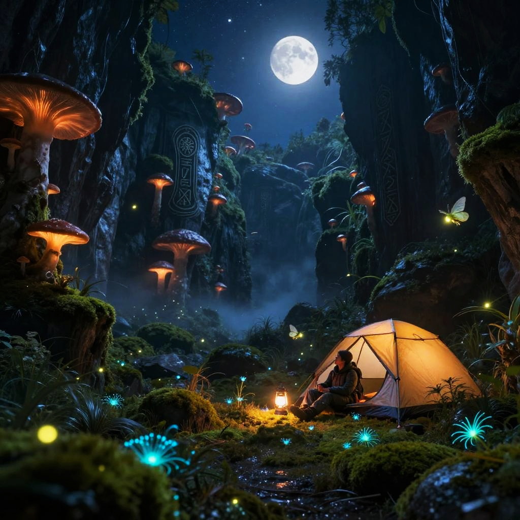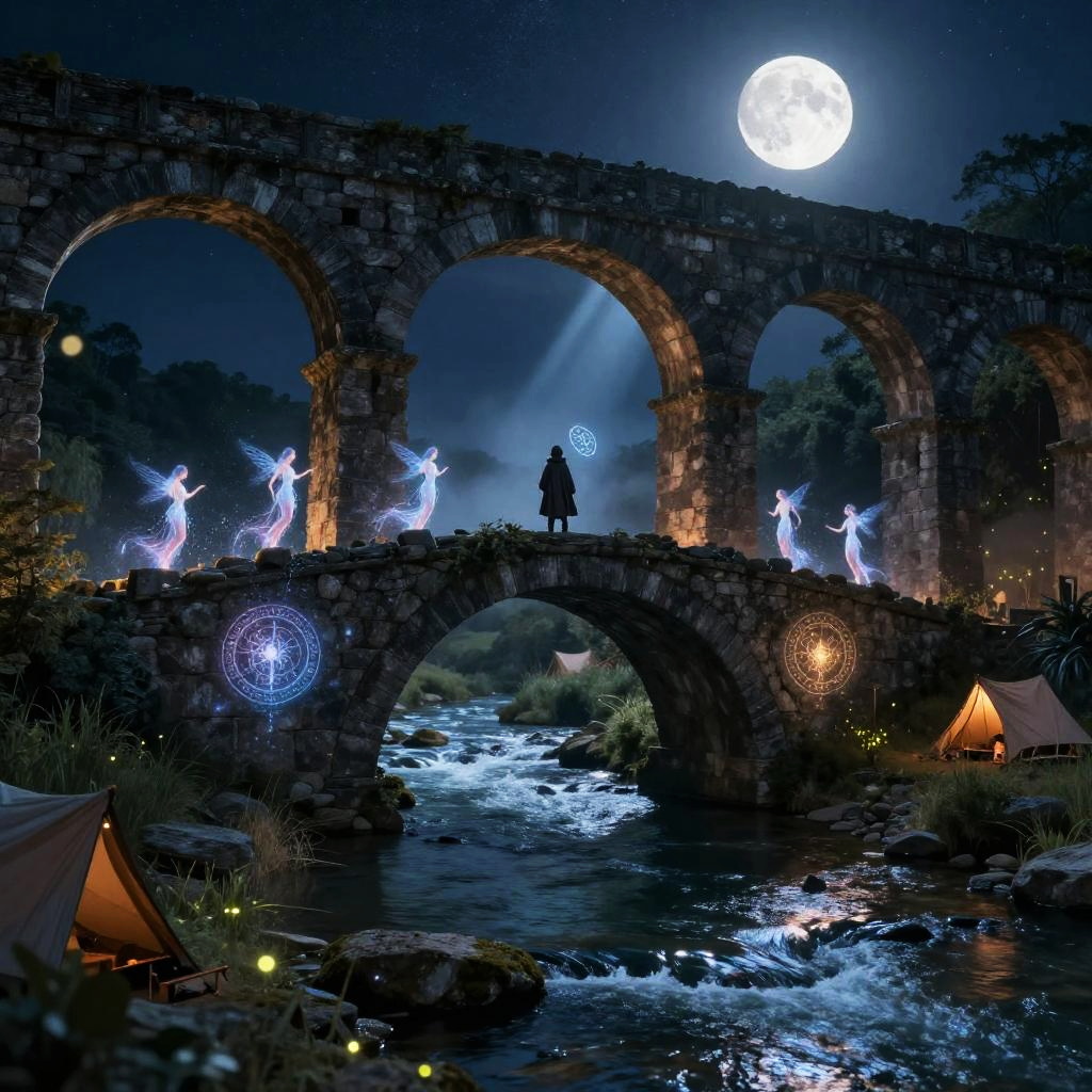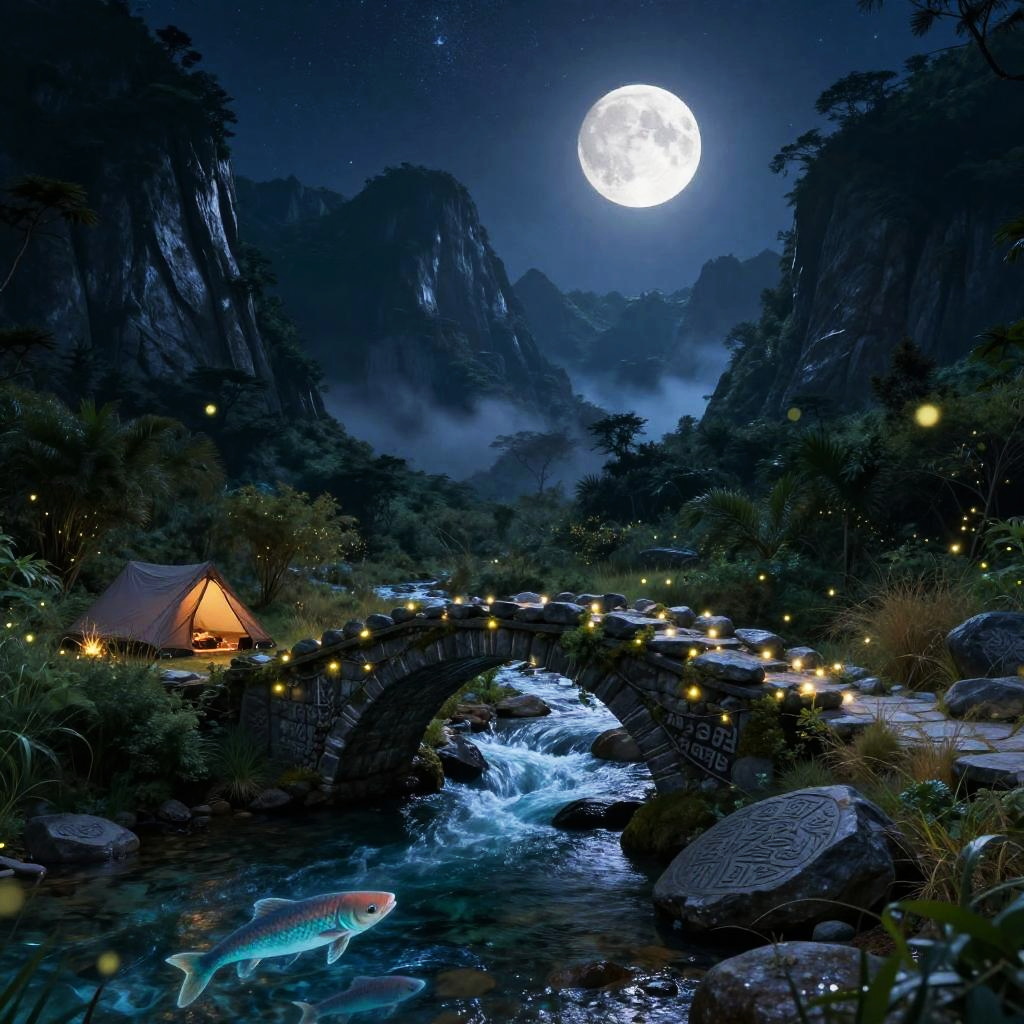 ASCII Masterpiece, (cosy), (ultra high res, mj, best quality, highly detailed:1.5), (cinematic), mythical nightscape in lush valley rimmed by towering mountain peaks, featuring ancient stone bridge over crystal clear river, infused with winking faerie lights, ghostly fish shadows, rune-carved stones, sky full of stars, wild camping ambience, (fireflies:1.5), intricate environmental details, volumetric moonlight, ambient mist, long exposure trails, subtle godrays, cinematic depth of field, soft bokeh, natural film grain, high dynamic range, hyperrealistic photography, 8K, night, full moon, masterful composition, unreal engine lighting