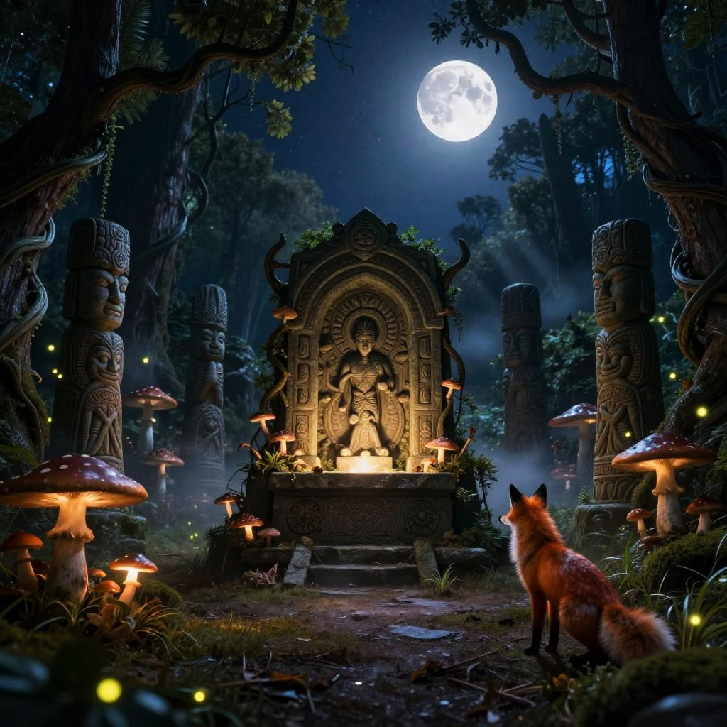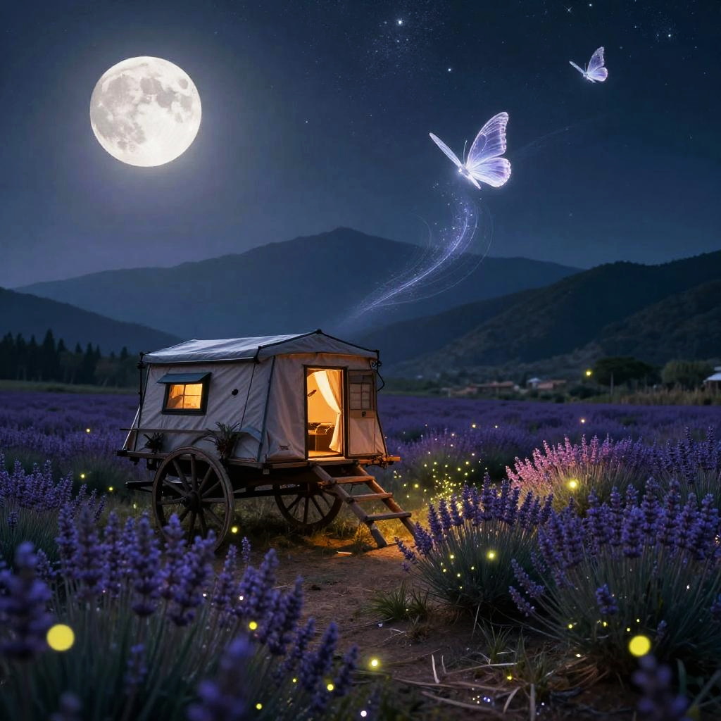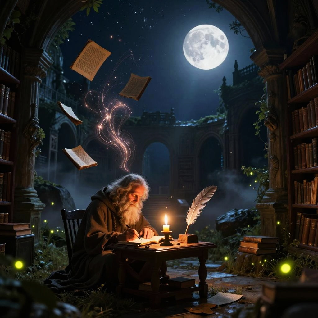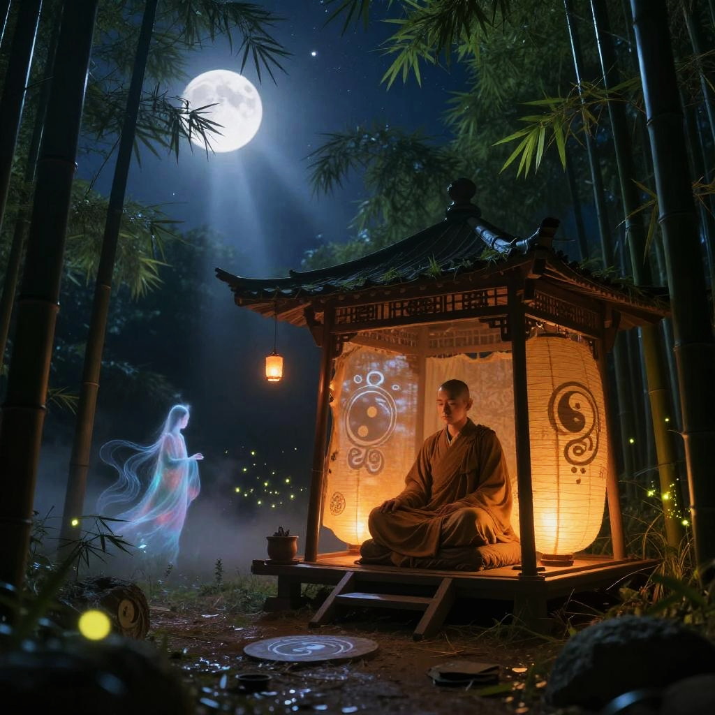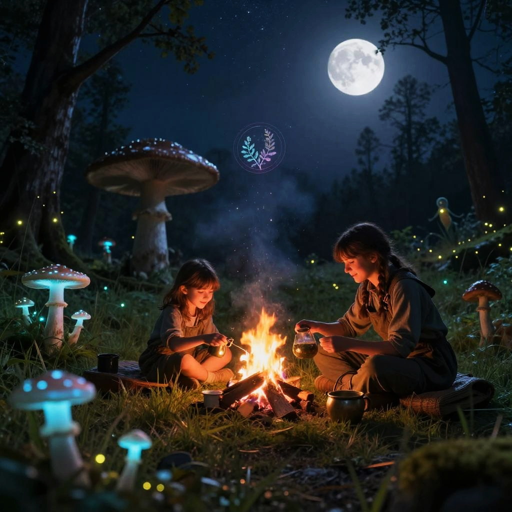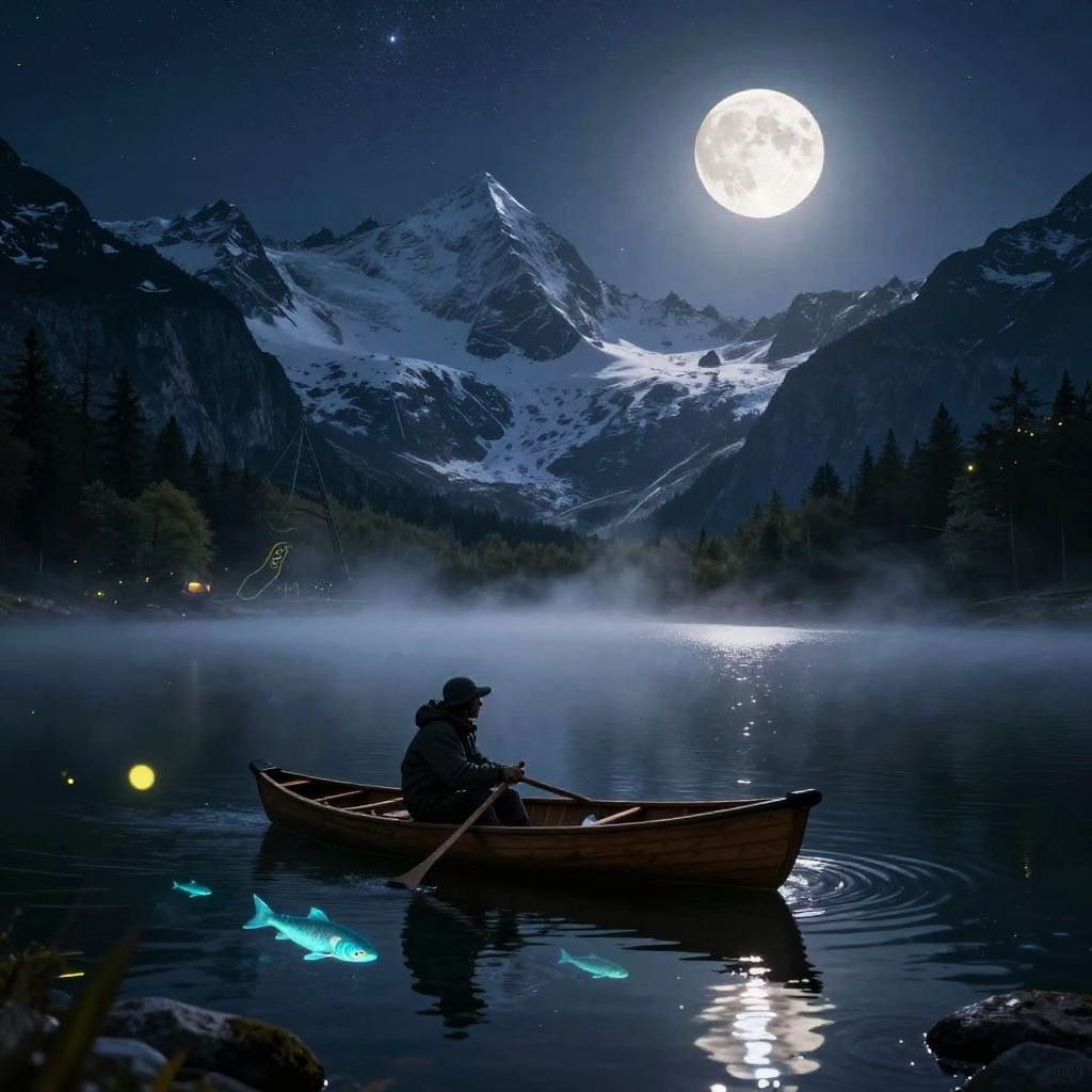 ASCII Masterpiece, (cosy), (ultra high res, mj, best quality, highly detailed:1.5), (cinematic), mythical nightscape in lush valley rimmed by towering mountain peaks, featuring ancient stone bridge over crystal clear river, infused with winking faerie lights, ghostly fish shadows, rune-carved stones, sky full of stars, wild camping ambience, (fireflies:1.5), intricate environmental details, volumetric moonlight, ambient mist, long exposure trails, subtle godrays, cinematic depth of field, soft bokeh, natural film grain, high dynamic range, hyperrealistic photography, 8K, night, full moon, masterful composition, unreal engine lighting