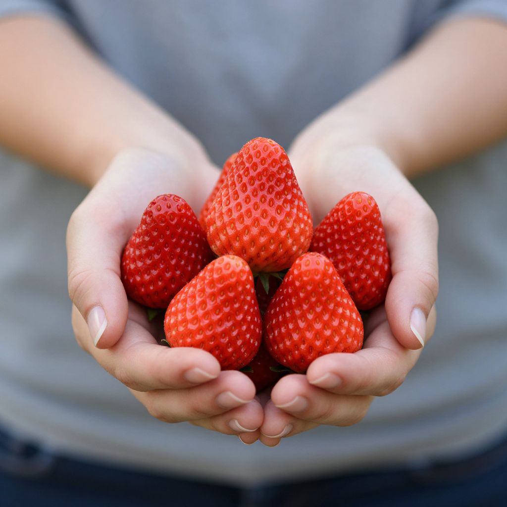 Photograph of pale hands with white nails cupping bright red, textured strawberries, blurred gray shirt and blue jeans background.