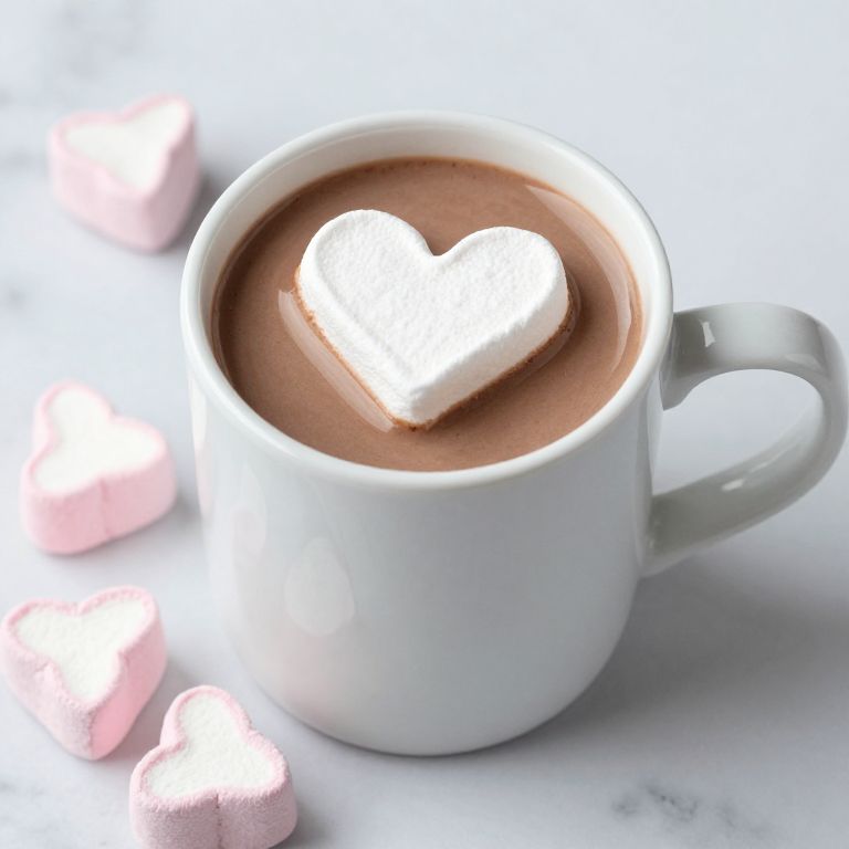 Cozy Peanut Butter Hot Chocolate served in a white mug, topped with a fluffy heart-shaped marshmallow, surrounded by three additional pink heart-shaped marshmallows on a light gray marble surface.