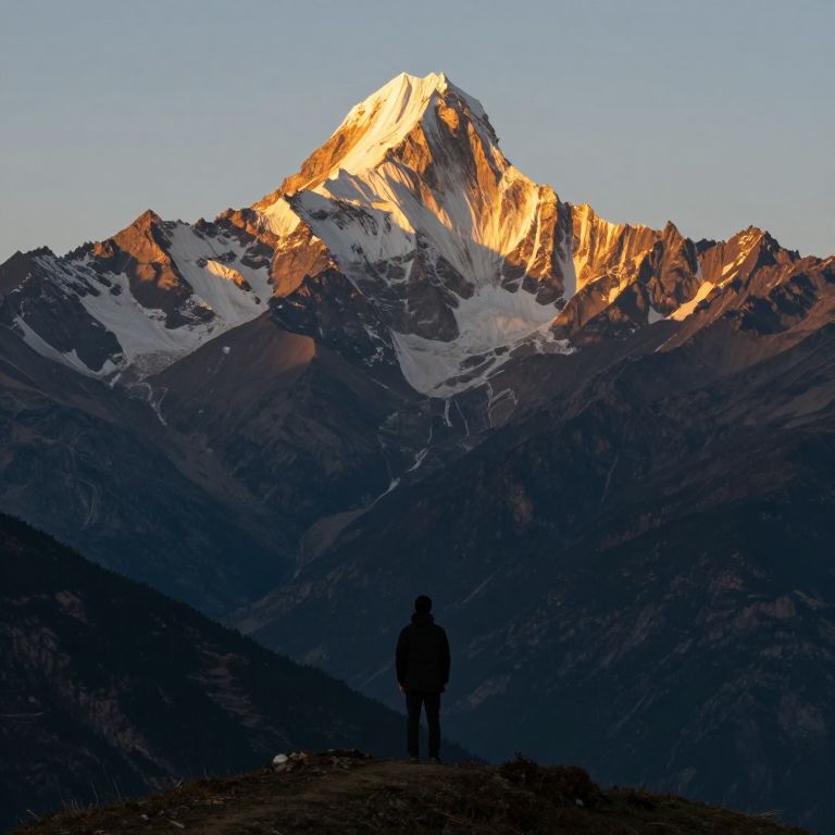 Photograph of a majestic mountain peak bathed in golden sunlight at sunset, with snow-capped ridges and rugged, dark brown slopes. A silhouetted hiker stands in the foreground, centered, facing the mountain. The sky is clear, transitioning from blue to orange near the peak. Shadows and light create a dramatic contrast. The hiker's figure is small and dark, emphasizing the towering, illuminated mountain behind them. The scene evokes a sense of awe and solitude in a vast, natural landscape.