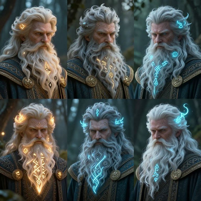 Photograph collage of an older, white-bearded man with glowing runes on his forehead, beard, and cloak in a dark forest. Runes alternate