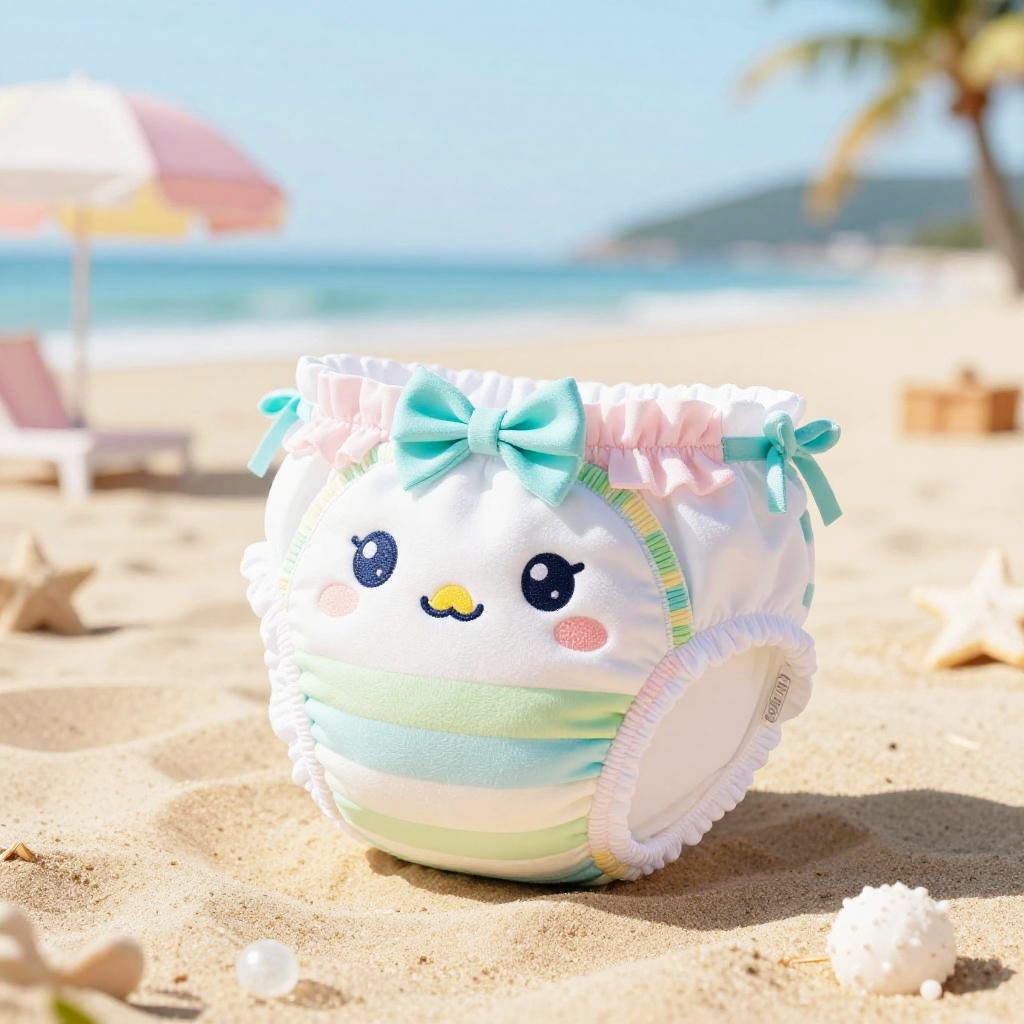 Bikini diaper fashion concept, a stylish baby wearing a cute, colorful diaper designed like a bikini bottom, set on a sunny beach background, soft pastel colors, playful and whimsical style, high detail, vibrant and fun atmosphere