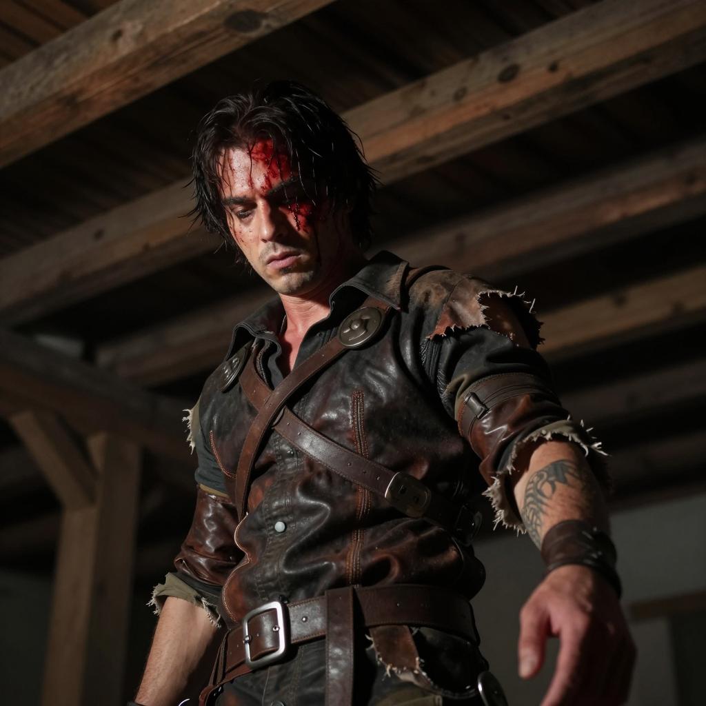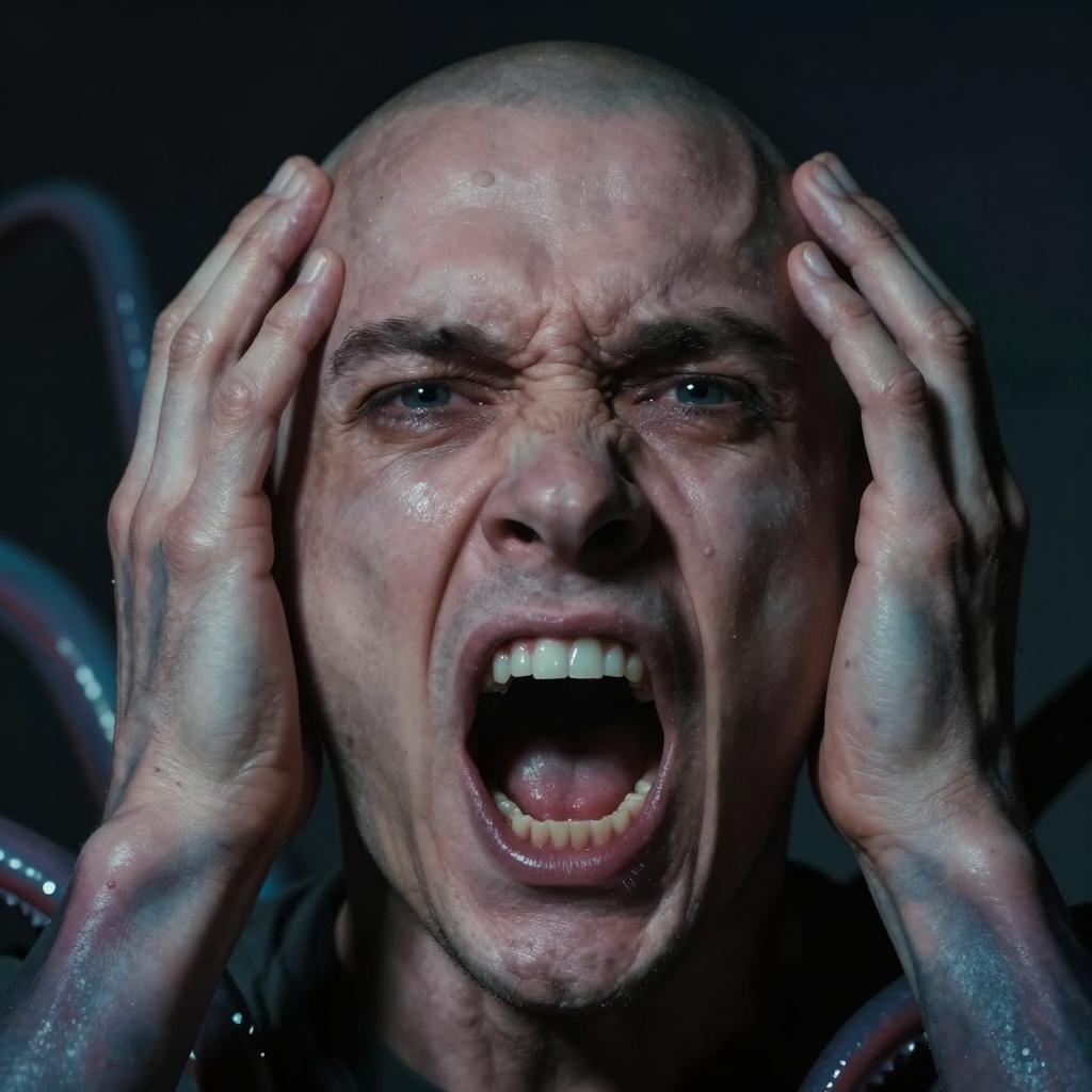 Close-up photograph of a disheveled man with long, dirty black hair, grimy face, and yellowish eyes. His face has dark, smeared makeup, and his teeth are slightly visible. Background is blurred and neutral. His expression is intense and unsettling.
