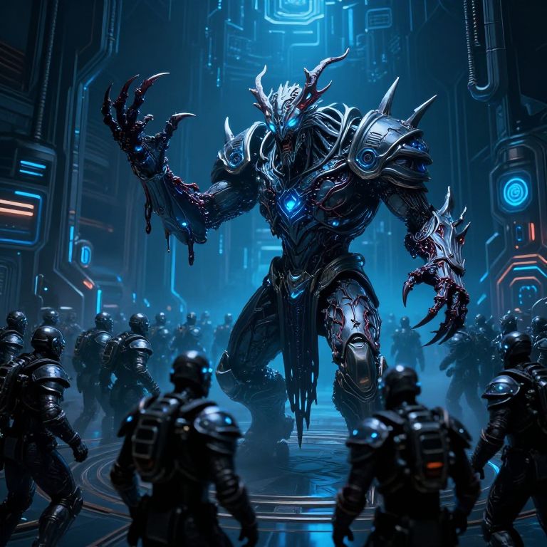 Digital artwork depicting a futuristic, cybernetic, monstrous creature with glowing blue eyes and intricate, black, metallic armor in a neon-lit, high-tech corridor. The creature, standing tall with massive, clawed hands raised, dominates the scene surrounded by a group of armored, helmeted soldiers in the foreground. The background is filled with blue and red neon lights, holographic displays, and metallic textures, creating a sci-fi, dystopian atmosphere. The creature's armor is jagged and spiked, with a glowing blue gem at its chest, adding to its menacing appearance. The image has a vivid, high-contrast, cyberpunk style.