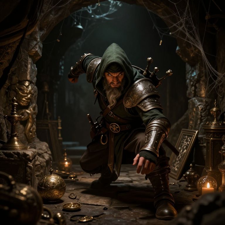 Gnome art dnd, a brave gnome rogue sneaking through a dimly lit dungeon filled with treasures and traps, dramatic lighting emphasizing shadows, intricate armor and gear, rich fantasy environment with cobwebs and stone textures, action-packed composition