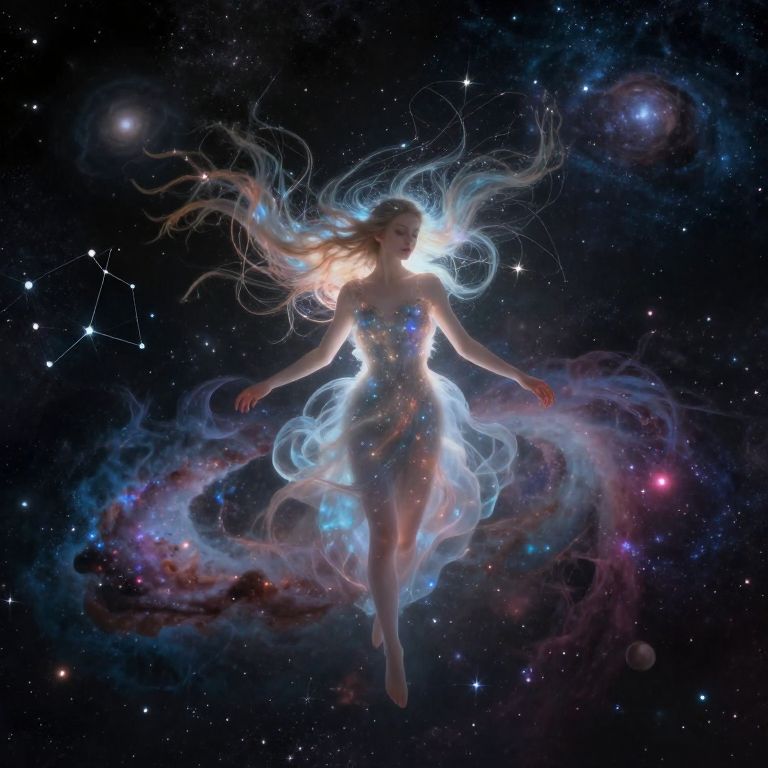 Digital illustration of a silhouette of a woman with flowing, ethereal blue and white hair, surrounded by cosmic clouds and stars. She floats in space, wearing a glowing, star-patterned dress that blends with the celestial background. Her arms are slightly outstretched, and her legs are gracefully extended. The background features a dark, star-studded sky with visible galaxies and nebulae, adding a mystical, otherworldly feel to the image. The woman's features are softly outlined, emphasizing her celestial, almost angelic presence.