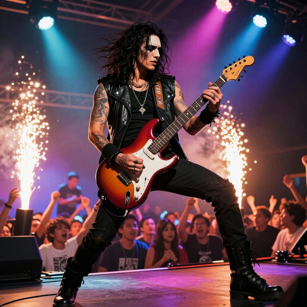 Girugamesh as a legendary rock musician performing live on stage, dynamic pose with electric guitar, vibrant colorful lights and pyrotechnics, intense crowd energy, stylized with graphic novel influences and dramatic contrasts.