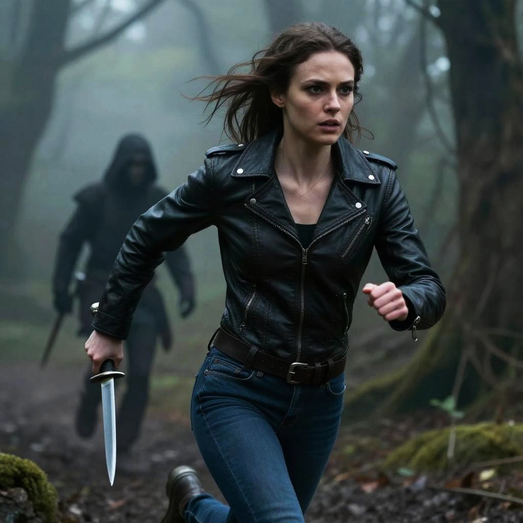 Photograph of a frightened woman with long brown hair, wearing a dark green jacket and blue jeans, running through a foggy, bat-filled forest.
