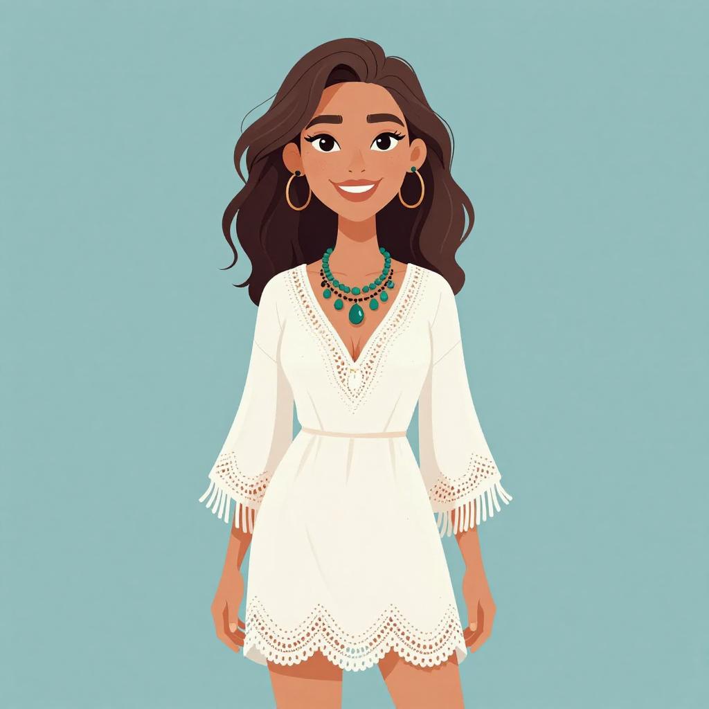 Illustration of a smiling woman with long dark wavy hair wearing a white bohemian-style shift dress featuring lace detailing, V-neckline, and bell sleeves with fringe accents. She accessorizes with a chunky tribal-inspired green necklace and gold hoop earrings, standing against a muted teal background.