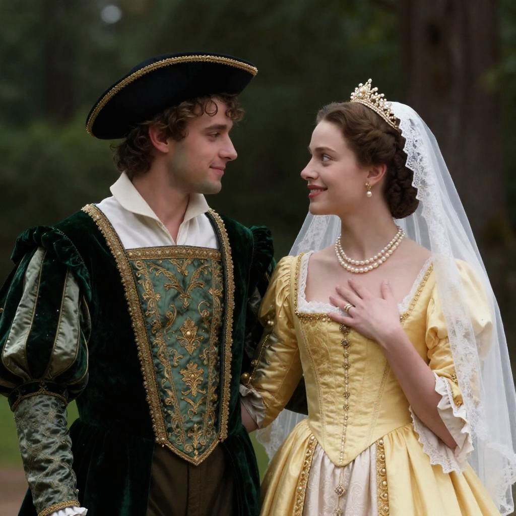 Two women with curly blonde hair in ornate, historical dresses stand in an opulent room. The woman on the left extends her hand to hold a rose offered by the woman on the right. Background: three lit candelabras, two other women in similar dresses, tapestry on the wall. Facial expressions: calm, focused.