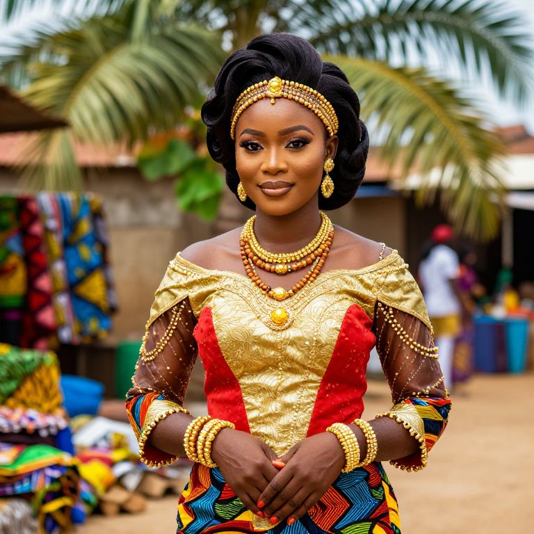 A vibrant Nigerian wedding photo featuring a beautiful young bride with a traditional Afro hairstyle adorned with gold beads and a matching beaded headpiece, wearing a colorful Ankara wedding dress in red and gold, standing in a lush outdoor market setting with palm trees and local fabrics in the background.