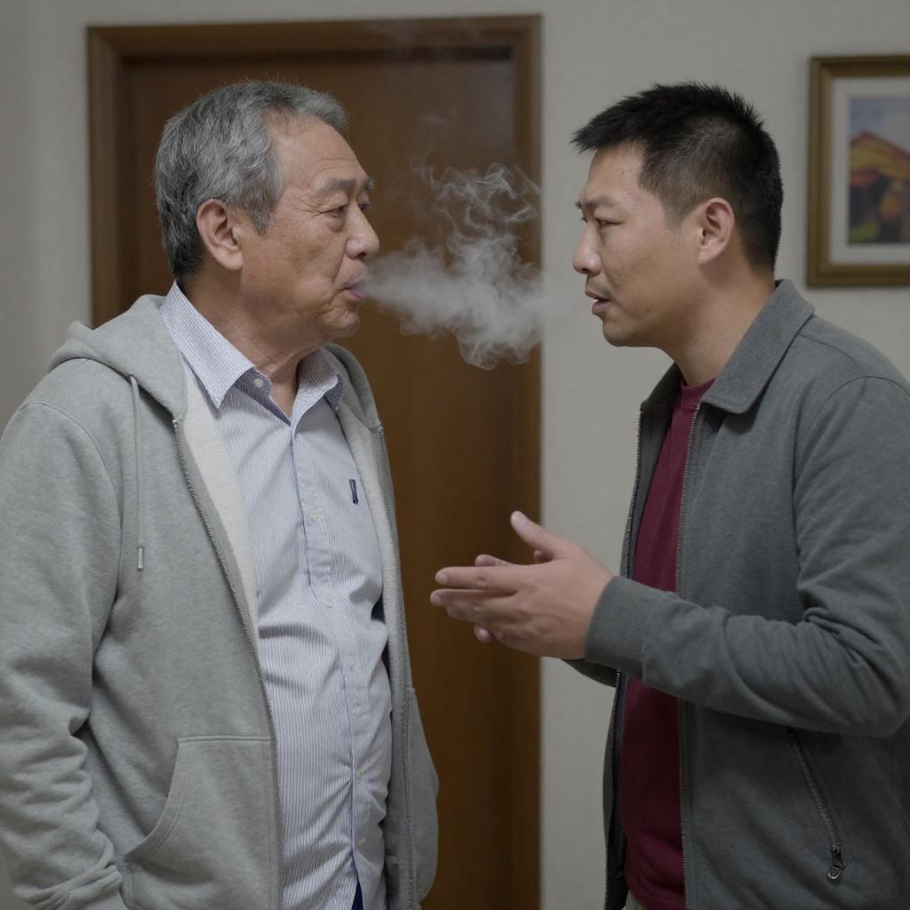 Photograph of two men in a room. The older man with gray hair, wearing a gray hoodie and striped shirt, exhales smoke. The younger man with short black hair, in a gray jacket and red shirt, leans in, gesturing with his hand. Background includes a door and framed picture.