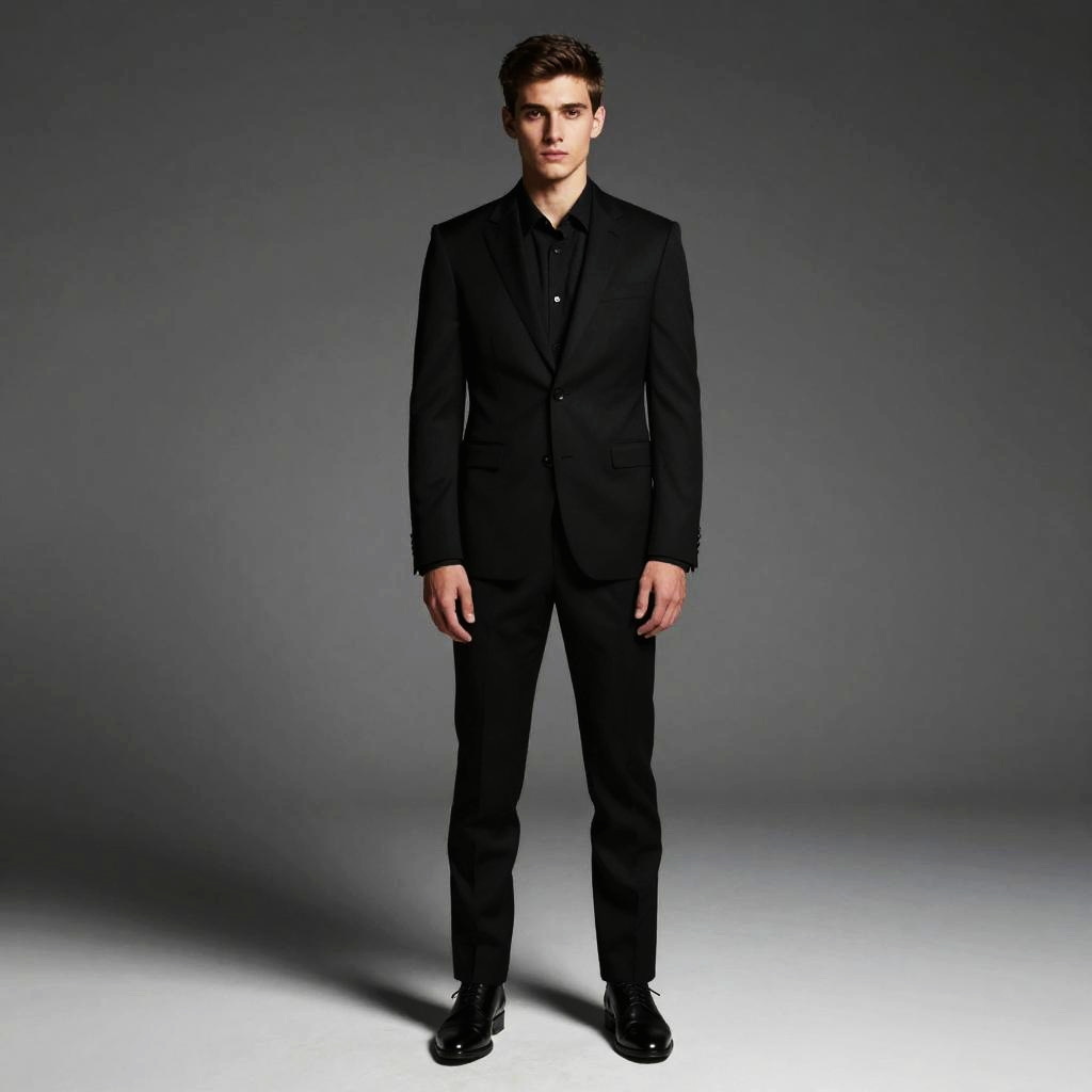 Photograph of a young Caucasian man with short, dark brown hair standing against a plain gray background. He wears a crisp white dress shirt with long sleeves, a black tie, and black dress pants. His hands are casually placed in his pockets, and he is wearing black dress shoes. His expression is neutral, and he stands upright, centered in the frame. The lighting is even, highlighting the clean lines of his formal attire. The floor is a light gray concrete, complementing the background. The overall style is modern and professional.