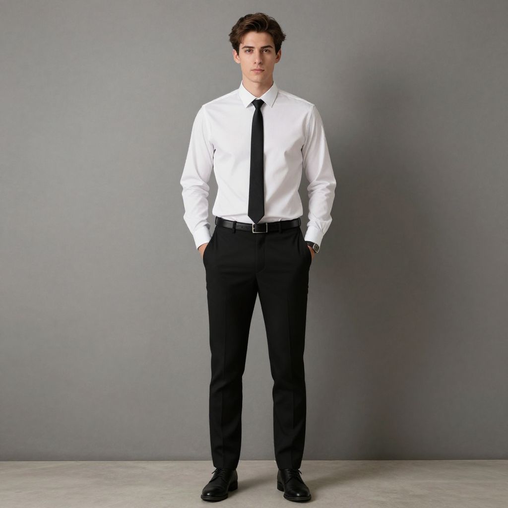 "black formal pants man, 1boy, male focus, solo, necktie, shirt, pants, black pants, hands in pockets, white shirt, full body, belt, standing, black necktie, collared shirt, brown hair, shoes, looking at viewer Realistic photo of casual sexy person with pretty face"