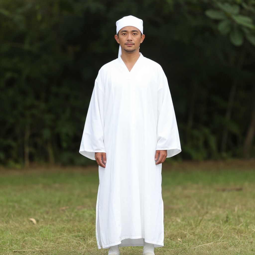 Photograph of a young Asian man standing on a grassy area with a dark green, leafy forest background. He has a medium brown complexion, short black hair, and a clean-shaven face. He is wearing a long, white, traditional Islamic robe (thawb) with a matching white cap. His expression is neutral, and he stands with his arms relaxed by his sides. The white robe contrasts sharply with the green grass and dark trees behind him, emphasizing his attire. The lighting is even, highlighting the simplicity and purity of his white clothing against the natural outdoor setting.