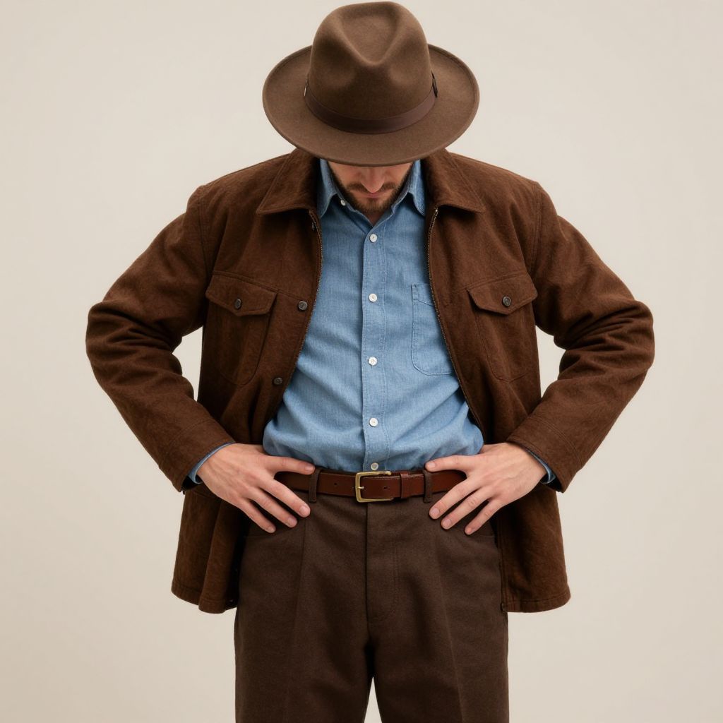 Man wearing a brown jacket, brown pants, and a blue shirt with a brown belt. He has a brown hat on his head and is standing with his hands on his hips.