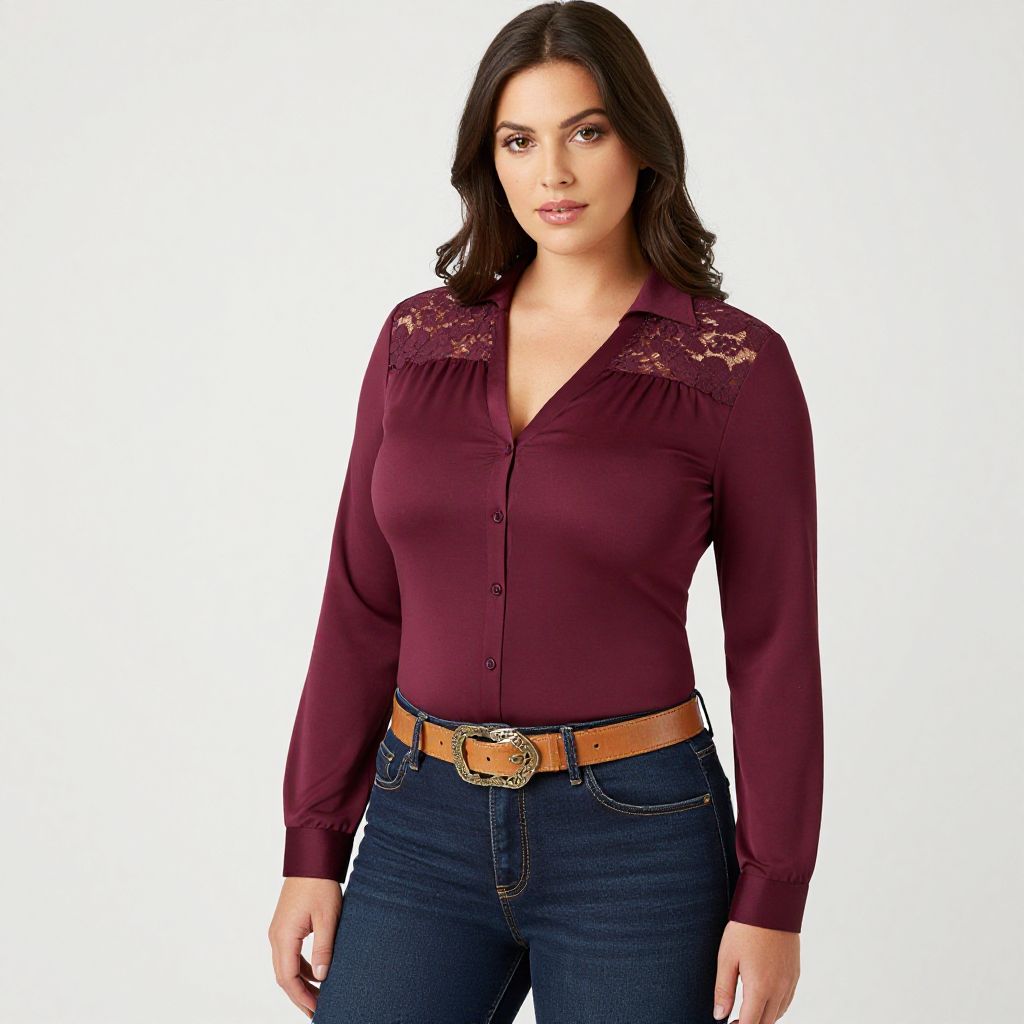 Photograph of a fair-skinned woman with long, dark brown hair, styled in loose waves. She has a slender build and is wearing a fitted, long-sleeved maroon blouse with lace detailing on the shoulders. The blouse is buttoned up to the neck. She pairs the blouse with dark blue jeans and a brown leather belt with a silver buckle. She stands against a plain white background, looking directly at the camera with a neutral expression. The lighting is even, highlighting the textures of her clothing and the lace on her blouse.