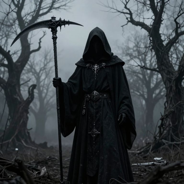 In this dark and foreboding scene, a humanoid figure, clad in a flowing, hooded robe of deep, ominous black, stands as the central focus. The robe is adorned with intricate, metallic details and is complemented by a belt of similar design, suggesting a connection to the arcane or the divine. The figure's face is obscured by a mask, adding an air of mystery and fear. In its right hand, the figure holds a long, curved scythe, its blade sharp and menacing, hinting at a role in death or retribution. The background is a stark, barren landscape, with twisted, leafless trees and a misty, gray sky, enhancing the sense of desolation and impending doom. The overall composition is balanced, with the figure centrally positioned, drawing the viewer's eye immediately to its imposing presence. The interplay of dark, muted colors and the stark contrast of the figure against the bleak surroundings create a powerful and unsettling atmosphere.