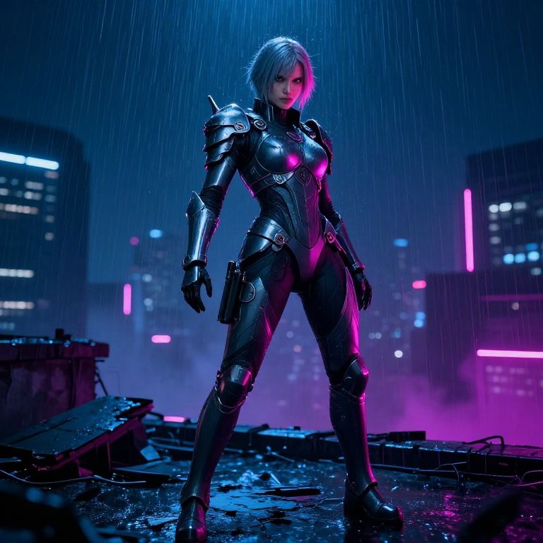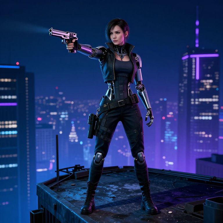 Cybernetic woman in black tactical suit, holding gun, standing on rooftop at night, neon city skyline background, intense pose. Photorealistic