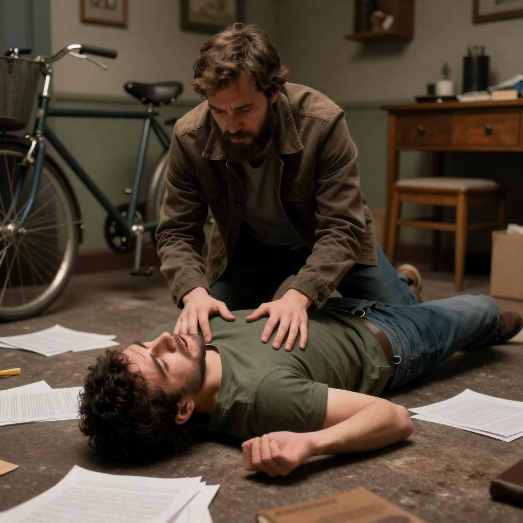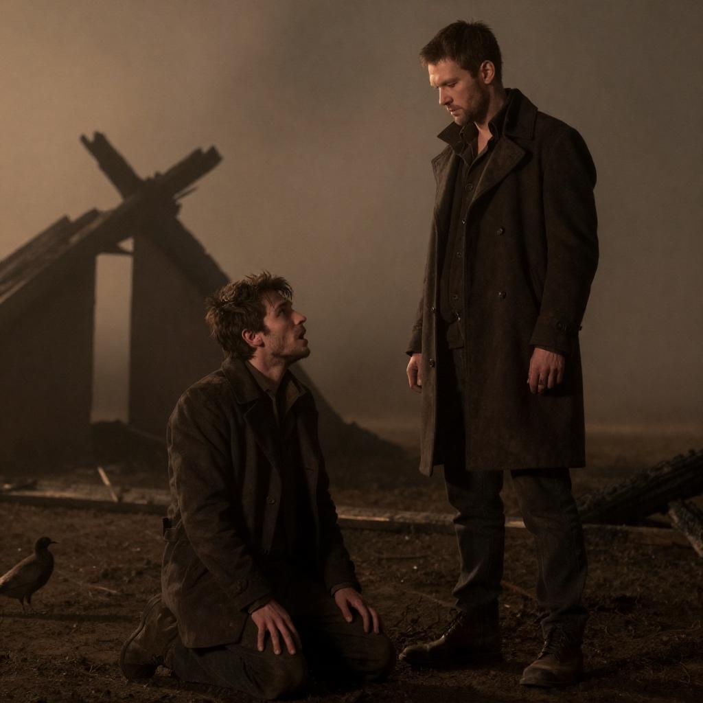 Photograph of two men in a dimly lit wooden room. One man in black jumps onto a table, while another man in black lies on the floor under the table. Bright windows in the background. Intense expressions.