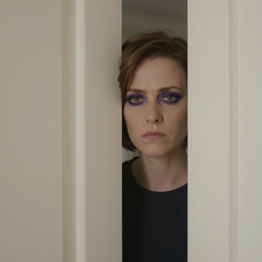 Woman with short brown hair and dark purple eye shadow peeks through a doorway. She has a serious expression. Beige doorframe on the left, white door on the right. Dim lighting. One person.
