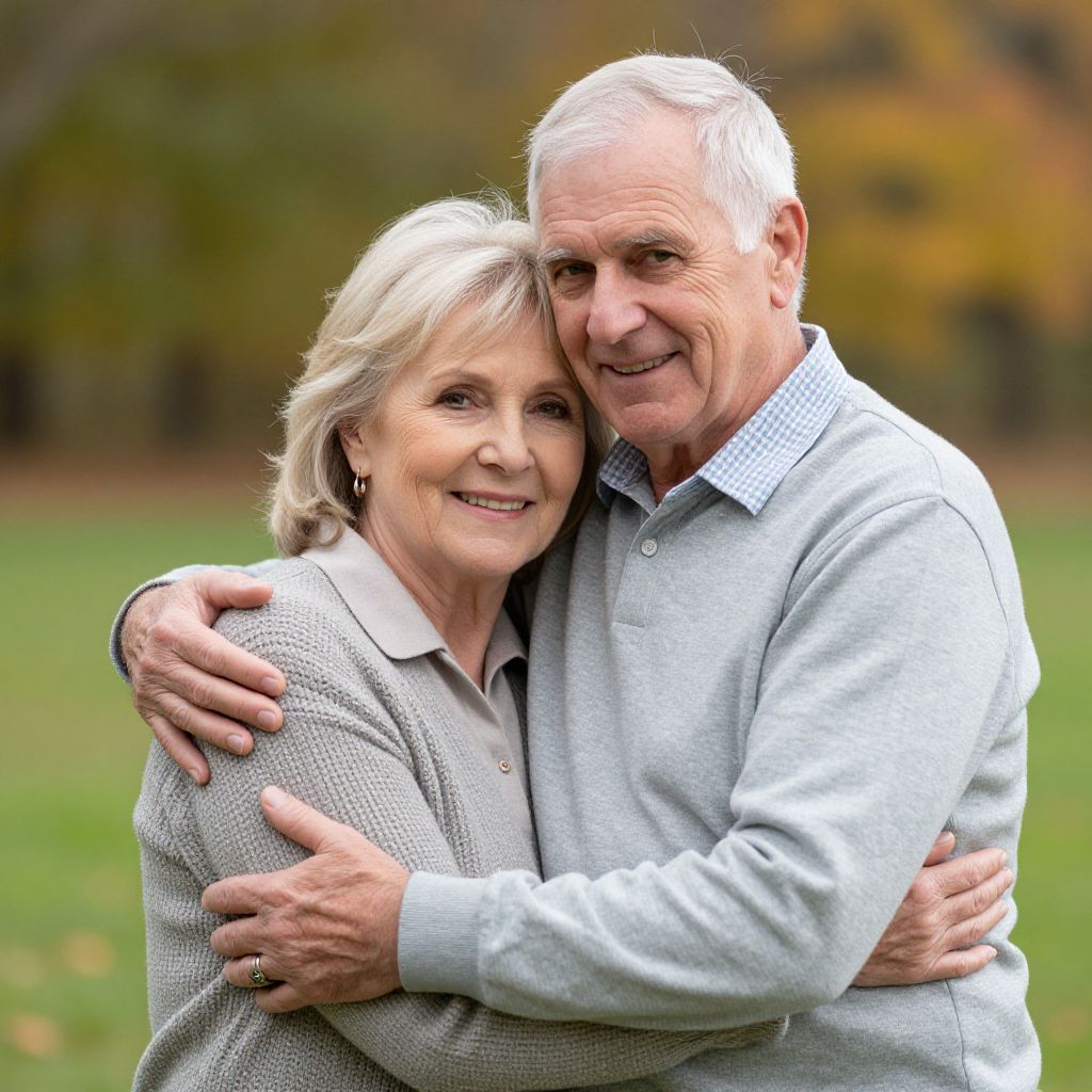 Elderly couple embracing warmly outdoors, with the man's arms wrapped around the woman's shoulders as they stand amidst a backdrop of green grass and autumn foliage.