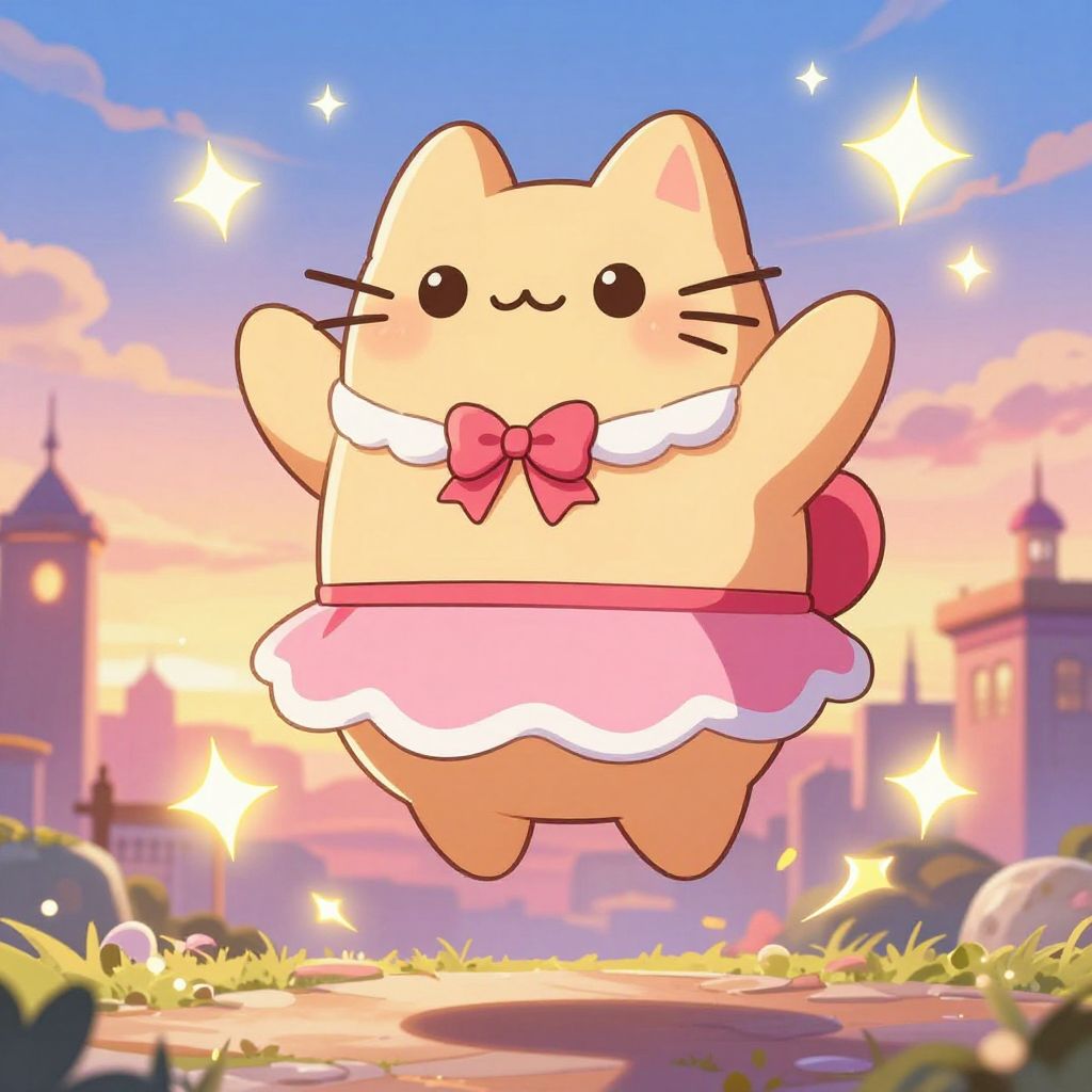 Pusheen anime girl in a magical girl outfit, sparkles and glowing effects, dynamic pose, bright colors, fantasy cityscape at sunset, anime style character design