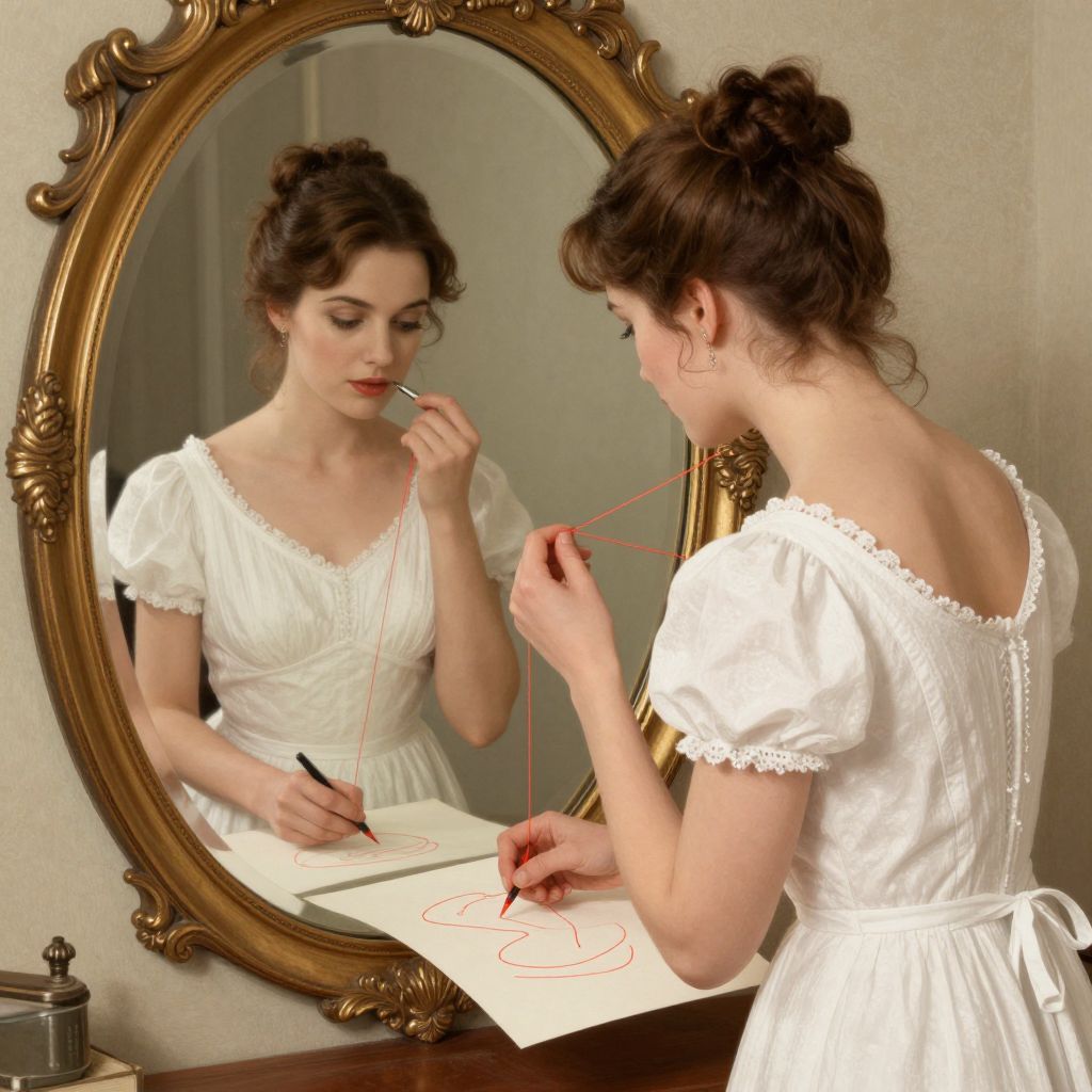 Photograph of a young woman with fair skin and dark brown hair in an updo, wearing a white, short-sleeved, lace-trimmed dress. She stands in front of an ornate, golden oval mirror, holding a pen and red string, drawing a simple, circular design on a piece of white paper on a wooden dresser. The reflection in the mirror shows her focused expression and delicate features. The background is a plain, beige wall, and a small, metallic container is partially visible on the left side of the dresser.