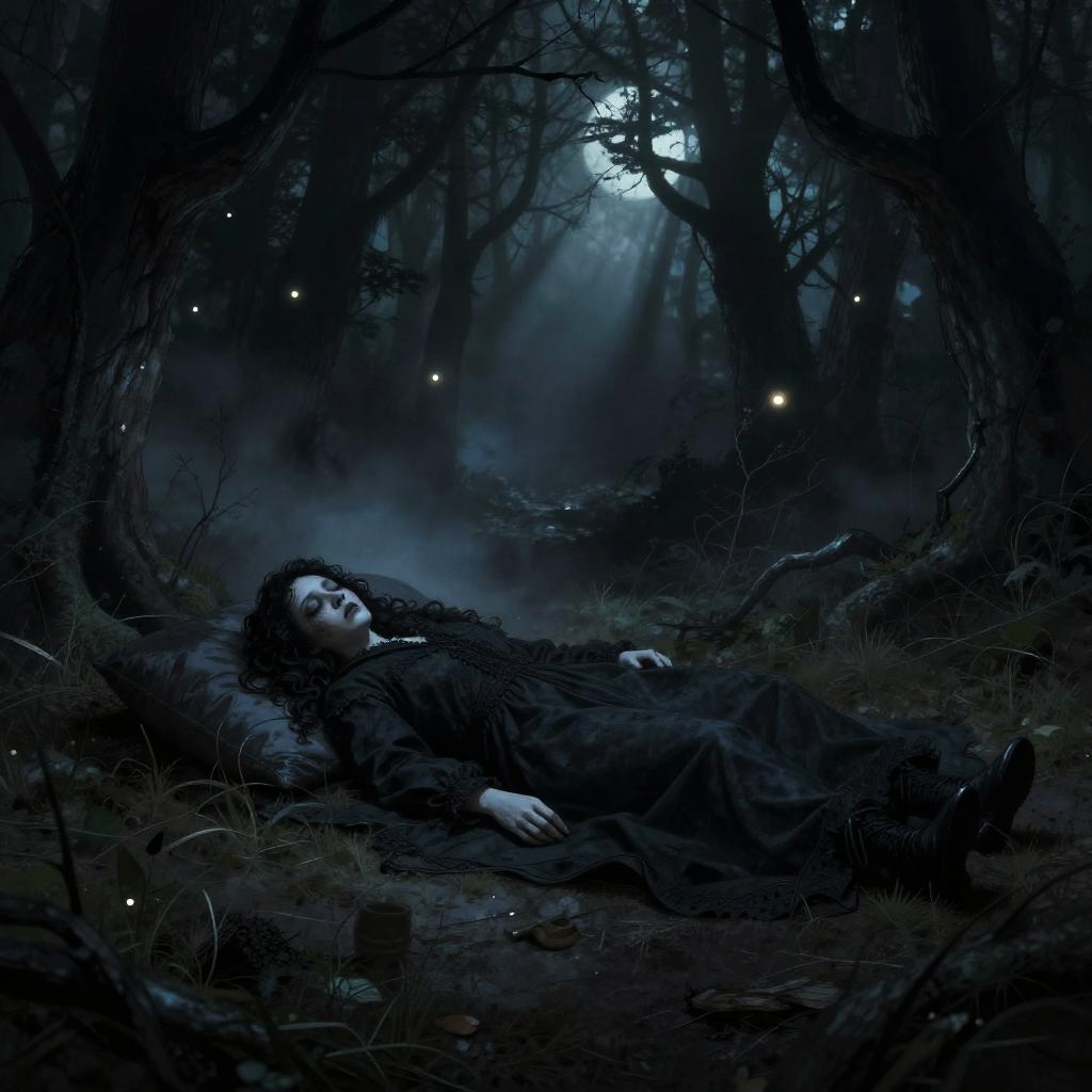 Creepypasta Russian Sleep, eerie dark forest at night with haunting shadows and glowing eyes, unsettling atmosphere with twisted trees and fog, chilling silence, detailed horror scene in a style blending digital art and atmospheric horror illustration