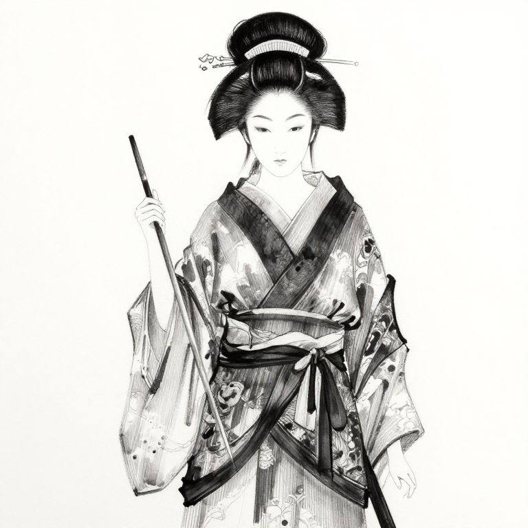 Black-and-white digital drawing of a Japanese geisha in traditional kimono, holding a fan, with a high bun hairstyle, against a white background.