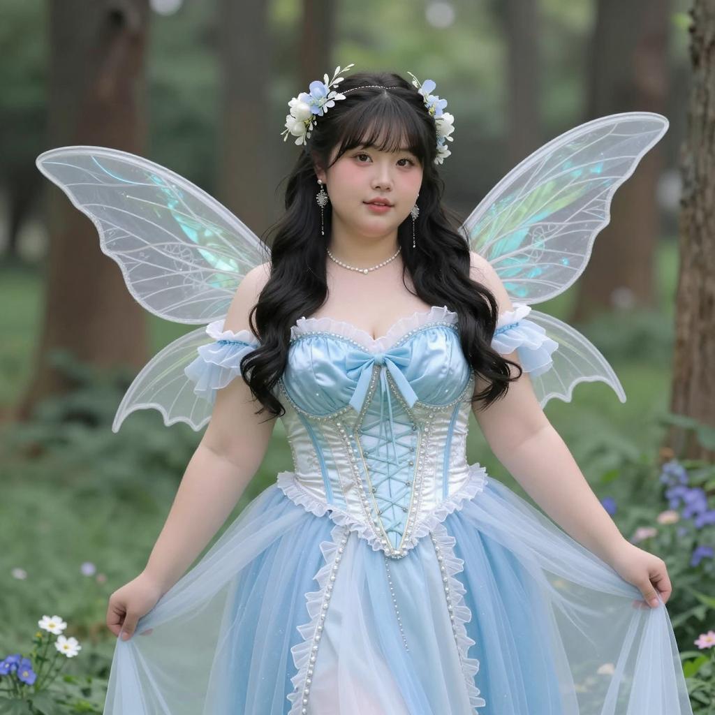 Plus size woman dressed in a blue fairy tale costume featuring a corset-style bodice and a full skirt. She has long black hair adorned with a floral headpiece and translucent fairy wings. The setting is a lush green forest with trees and small flowers surrounding her.