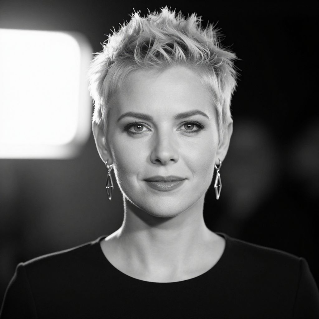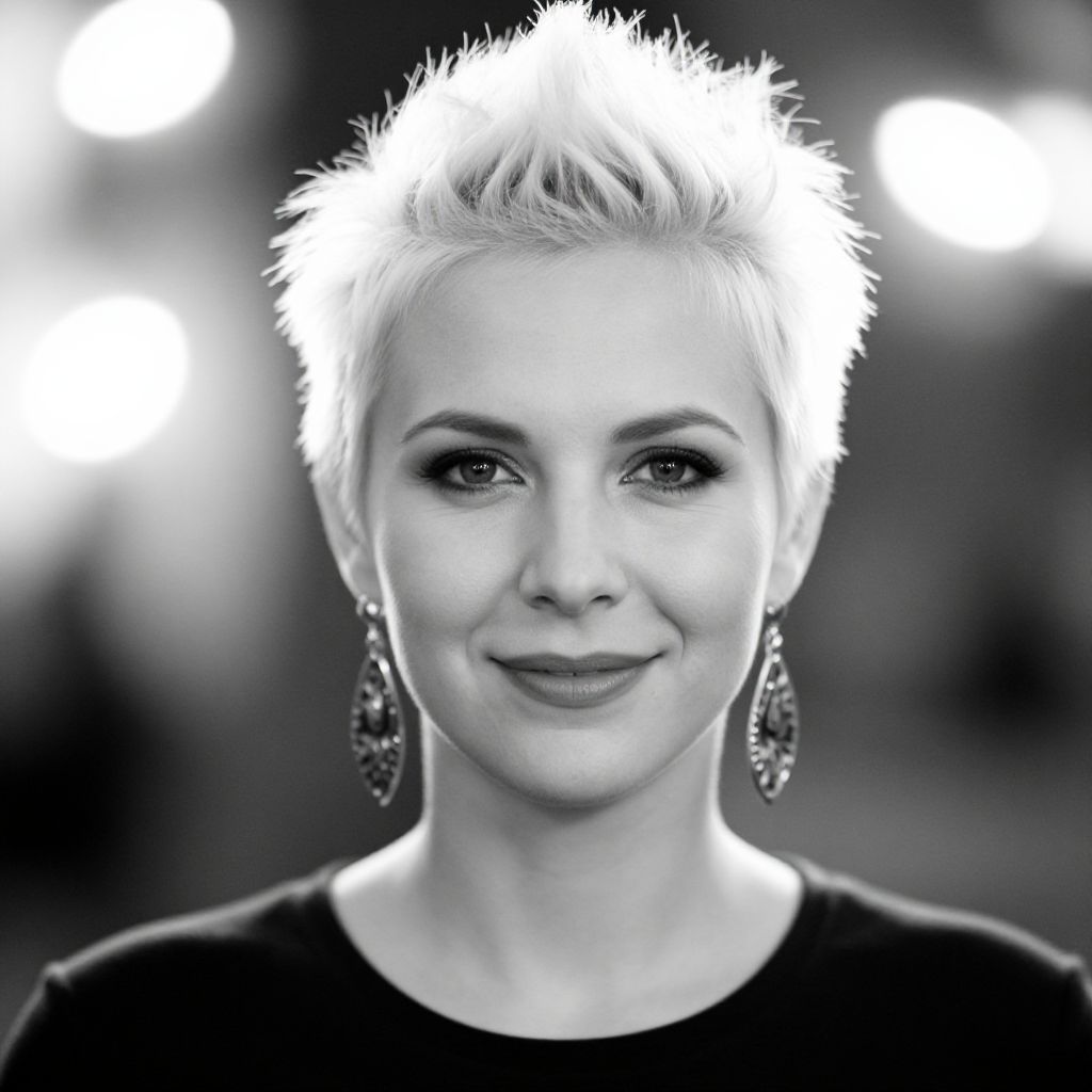 Black-and-white photograph of a woman with short, spiky, platinum blonde hair and fair skin. She has a subtle smile, wearing large, dangling earrings with intricate designs, and a simple dark top. The background is blurred with bright lights, creating a bokeh effect. Her makeup is minimal, emphasizing her natural beauty. The lighting highlights her hair and earrings, adding a dramatic contrast.
