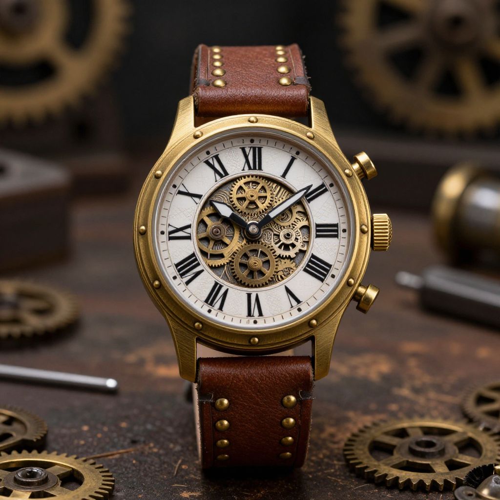 Wantch steampunk-inspired wristwatch featuring brass gears, leather straps with rivets, ornate clock face with Roman numerals, old workshop background filled with tools and cogs