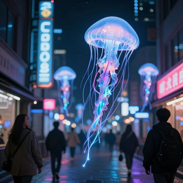 Antigravitational jellyfish drift above neon-lit streets, trailing bioluminescent sound waves that alter pedestrians' emotions on contact.